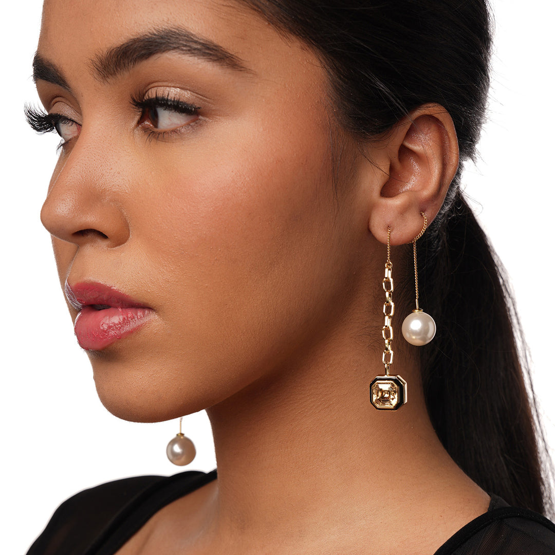 A unique gift for the most special person in your life. Bougie Crystal Pearl Threader Earrings these 18-karat gold-plated earrings are strung with lustrous pearl and high-shine enameled crystal that will reflect light as your partner moves.