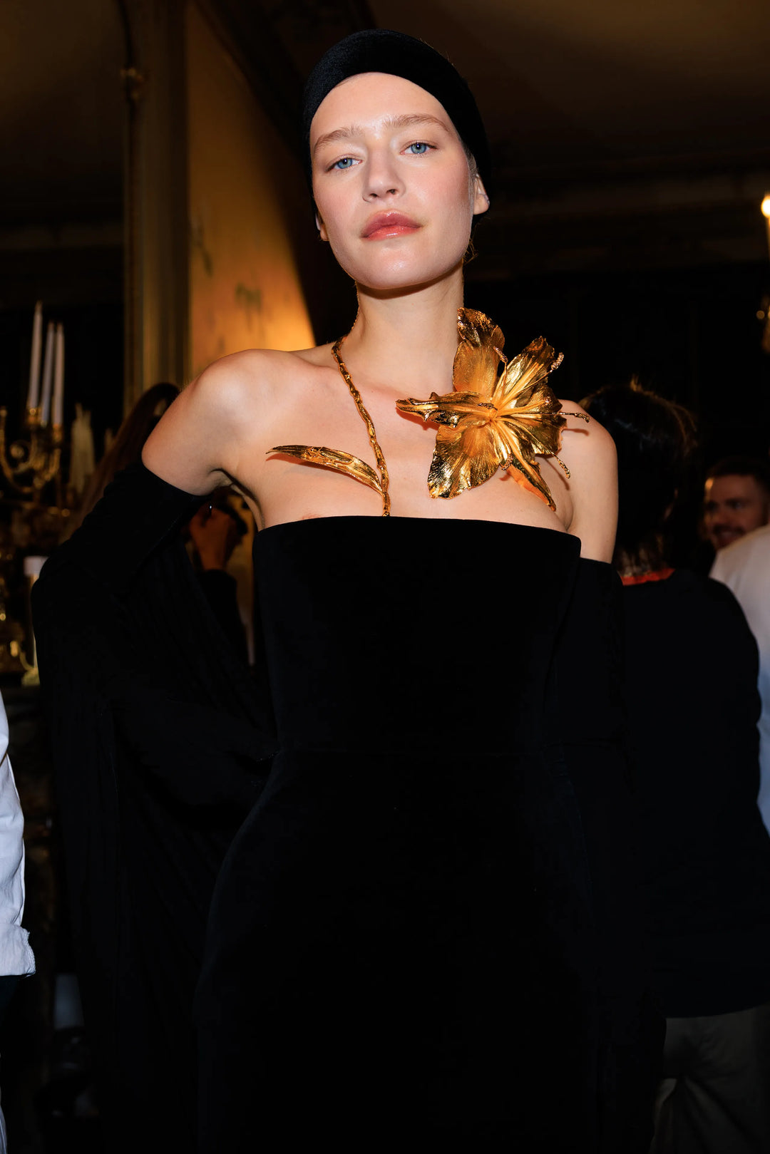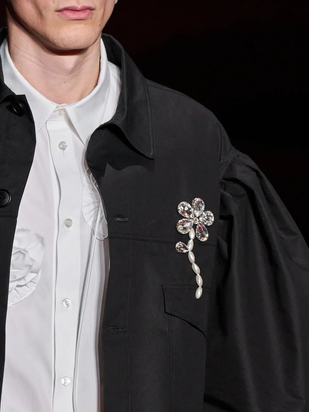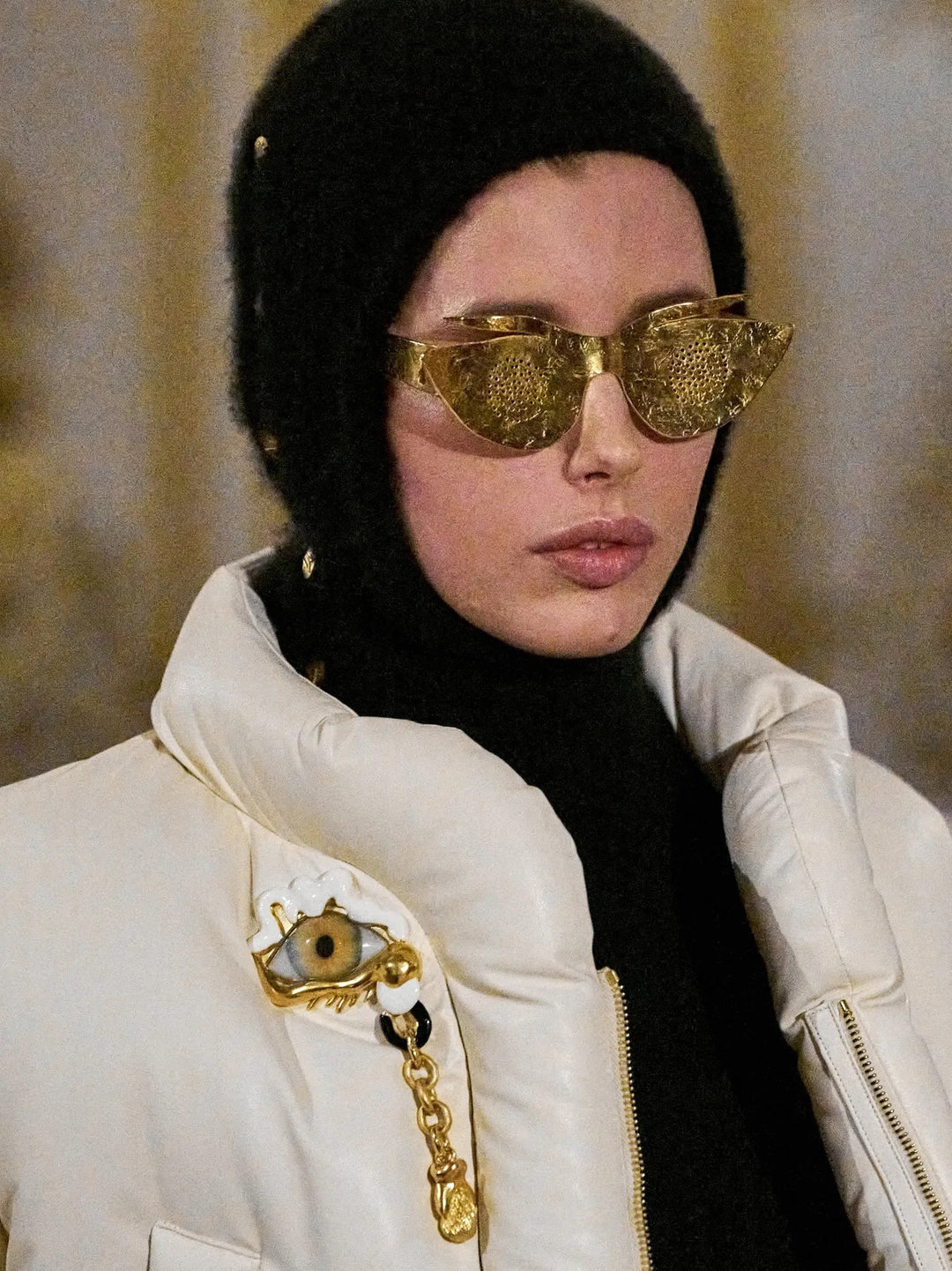 Brooches made a major comeback this year. Our favorites include Schiaparelli’s surrealist version of the evil eye, Coperni’s statement iteration in silver, Louis Vuitton’s trumpet style pin and Gucci’s all-pearl chains hooked to a vibrant blue knit.