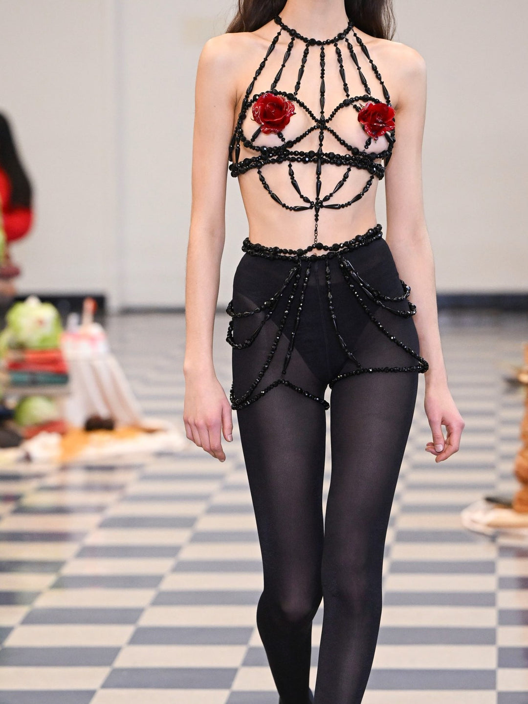 There was a resurgence of body jewelry this season. This style made a comeback with nail extensions, body chains, and fantasy jeweled bras spotted at Rodarte, Dilara Findikoglu, Paco Rabanne and Puppets and Puppets, among others.