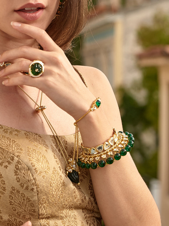 This Isharya bracelet is embedded with a distinct green hydro at the center and beautiful polki-cut mirrors along with CZ on either side. Style yours for a night of intimate celebration with your loved ones.