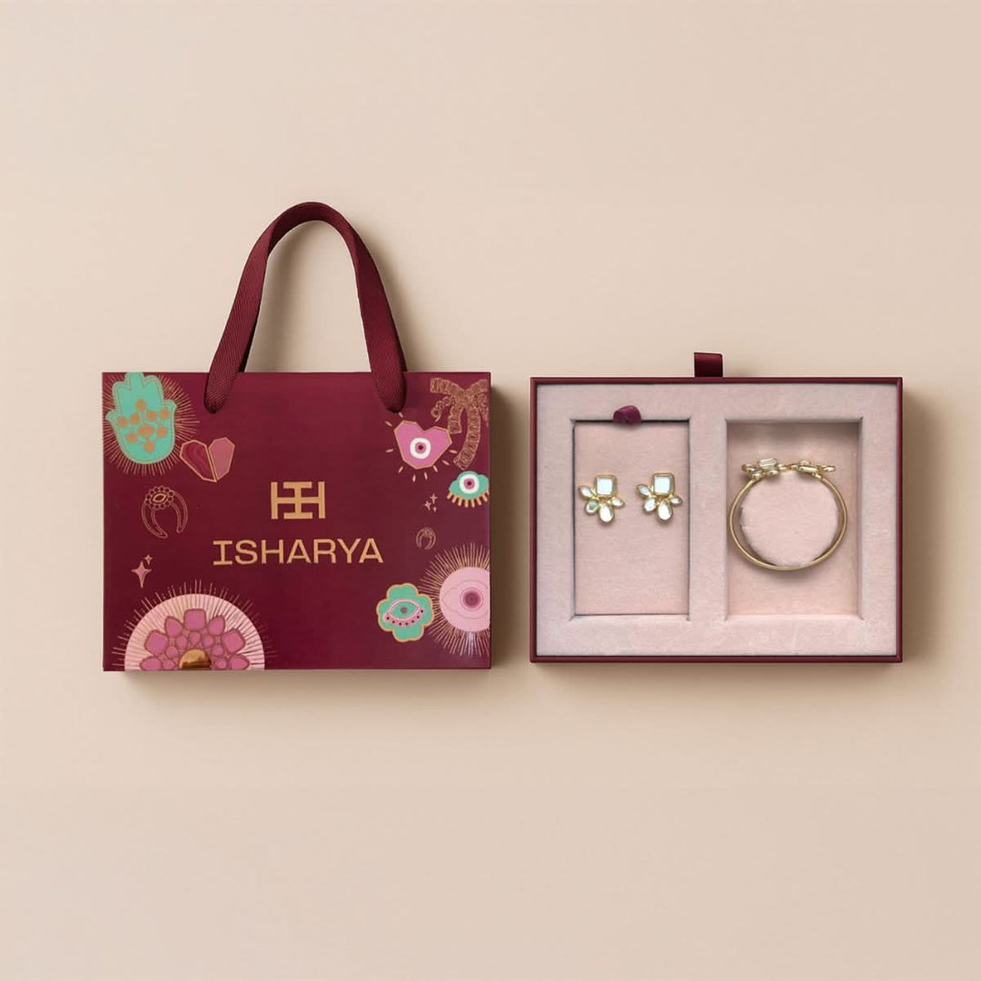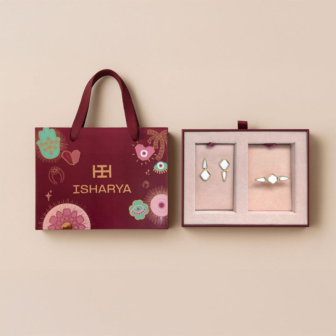 If you thought Valentine's Day was only to celebrate romantic relationships, you are wrong! These days, the younger generation uses this occasion to celebrate all their relationships. Women, especially, love celebrating Galentine's. It's like Valentine's Day but for your girlfriends. Women love getting together for brunch and spoiling each other with beautiful presents. If that's your idea of celebrating Valentine's Day this year, then we've got the perfect Valentines gift jewellery for you. Indulge your friends in the prettiest earrings, necklaces, rings and bracelets from Isharya. You can even buy matching charm bracelets with your besties. Pieces from our I For Isharya collection with pops of enamel and playful motifs are perfect for celebrating this day with your loved ones. You can buy these online or in our stores located in Mumbai, Delhi, Chandigarh, Bengaluru, Noida, Gurgaon and Kolkata. Our store staff will be more than happy to help you pick the perfect Valentines gift jewellery. They'll even wrap it up for you in our new packaging. Lucky for you, we've recently revamped our packaging in new colours like pink, burgundy and rose gold, which are perfectly in theme with Valentine's Day. So, there's no need to gift wrap your presents separately! On this day, if you'd love to celebrate any loved one like a mom or a sister, we have jewellery options for them, too. We recommend exploring our High and Bestsellers collection. With rare custom-cut crystals and hand-cut mirror work, the pieces in this collection are sure to make your loved ones swoon.