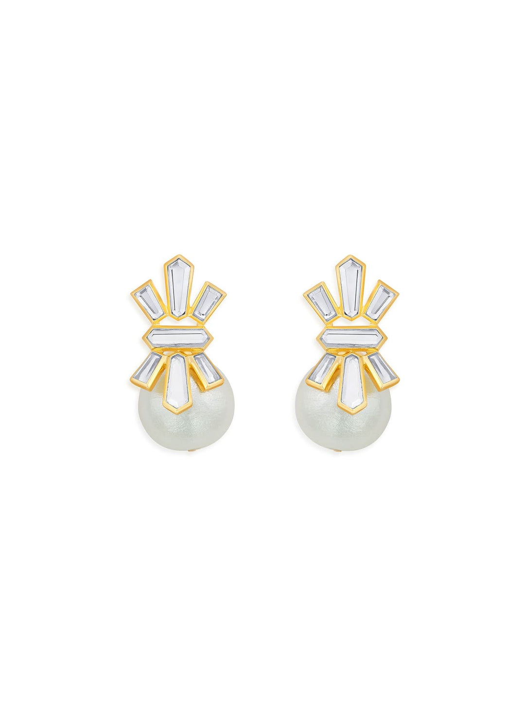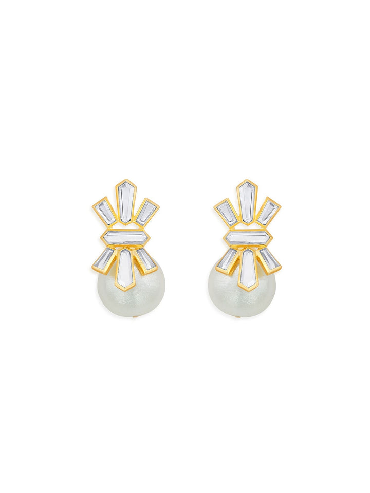 Baguette hand-cut polki mirror motif in gold-plating accented by a cotton pearl. Frame your face with the lustre of a pearl and some sparkle anytime you want to add a touch of class and sophistication.