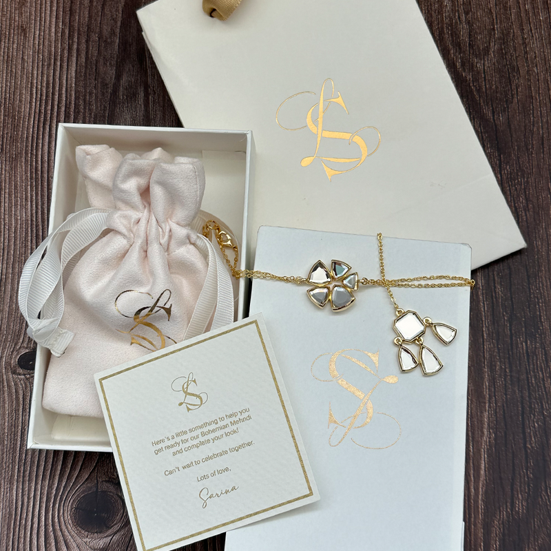 Choose your favourite design(s) and let us tailor the jewellery and packaging to your celebration’s theme, palette, or story.