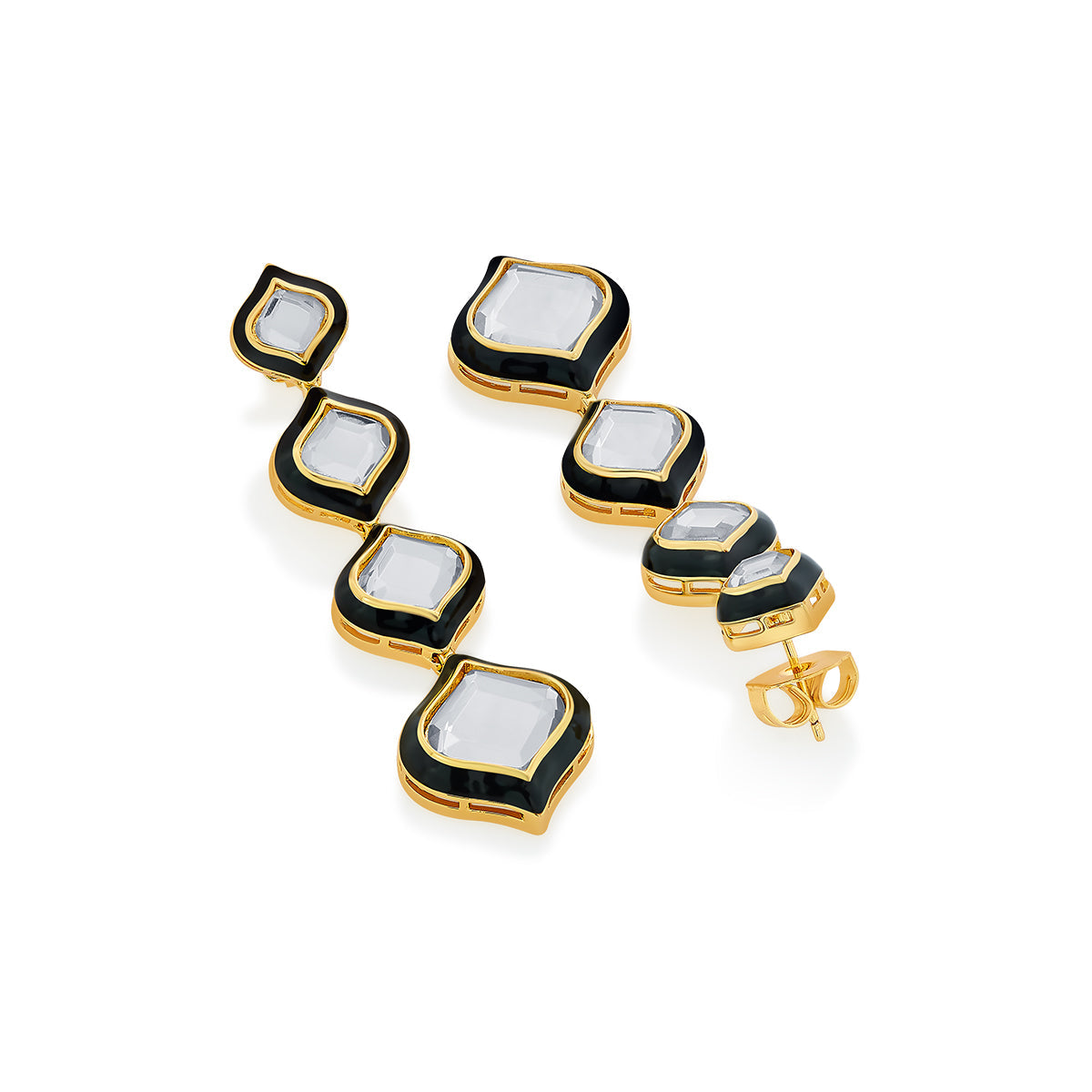 Each piece from ‘Q’ oozes glam and sophistication. These long 18-karat gold-plated styles, for instance, are crafted with polki-cut mirrors that will remind you of details found in iconic Mughal architecture. Wear it with your hair tied loosely in a bun.