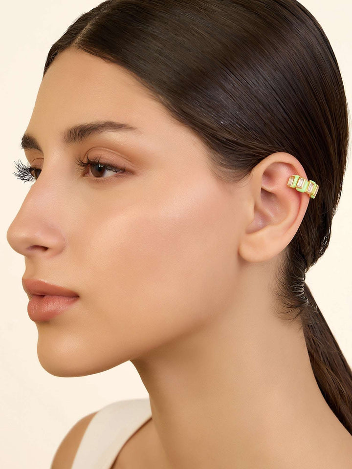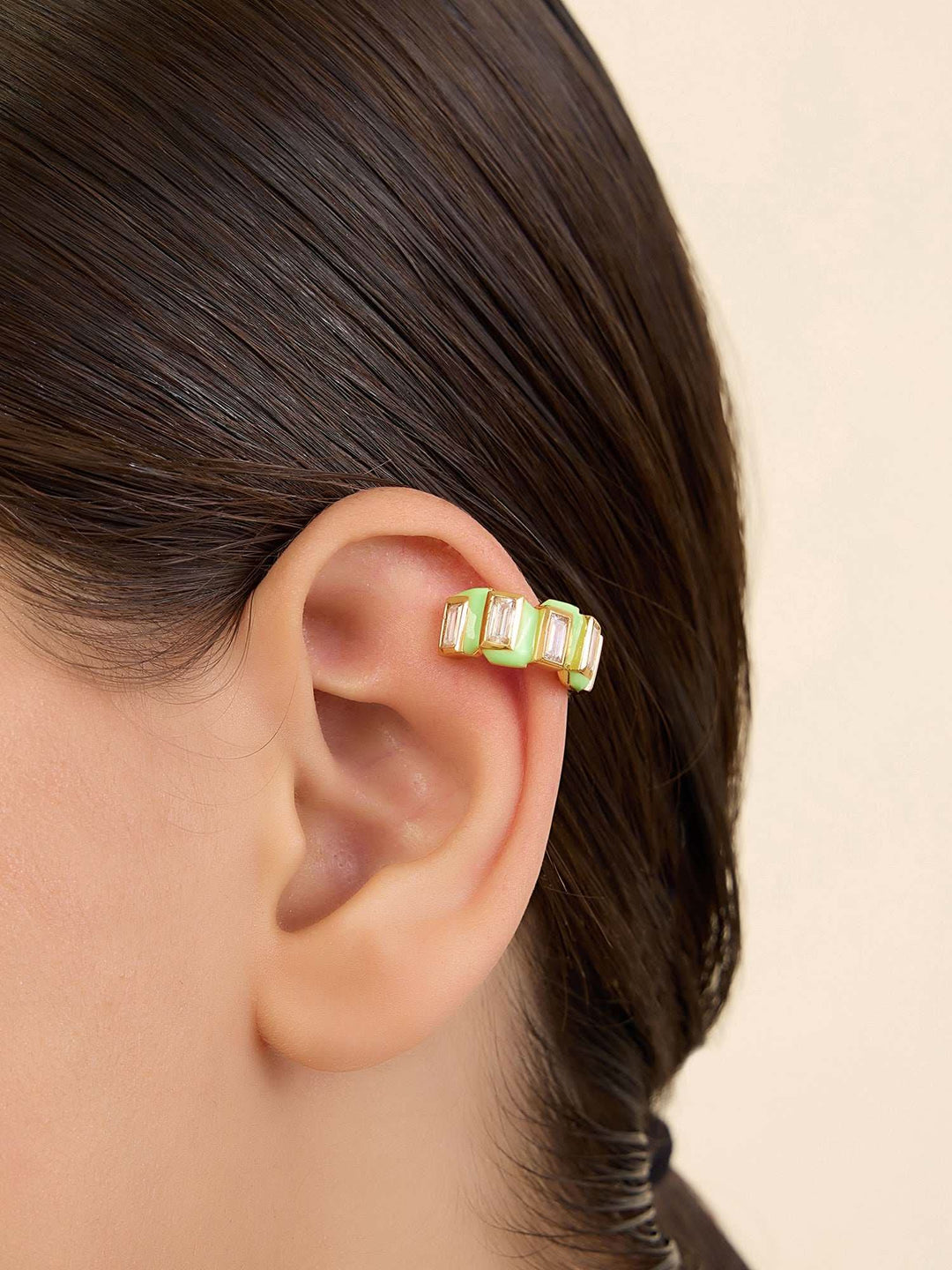 Introducing our playful Green Enamel Ear Cuff! With CZ stones and 18-karat gold plating, this unique ear cuff is perfect for everyday wear or party wear. Stand out from the crowd and add a playful touch to your style with this quirky piece. (You'll be the talk of the town!)