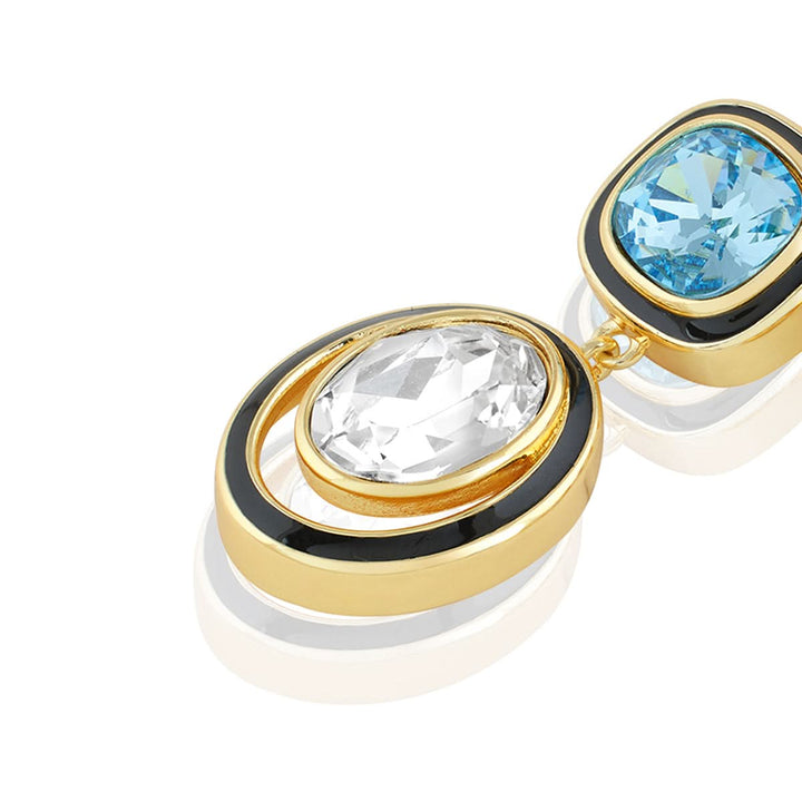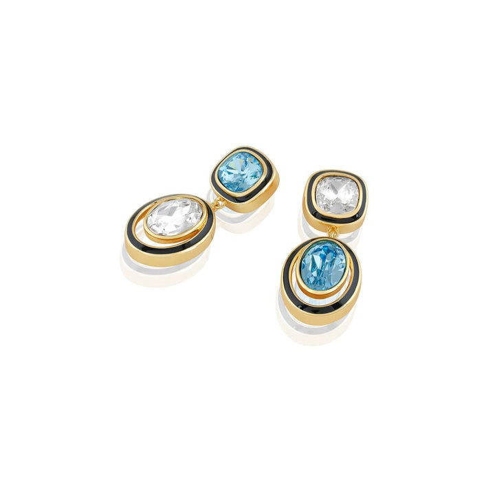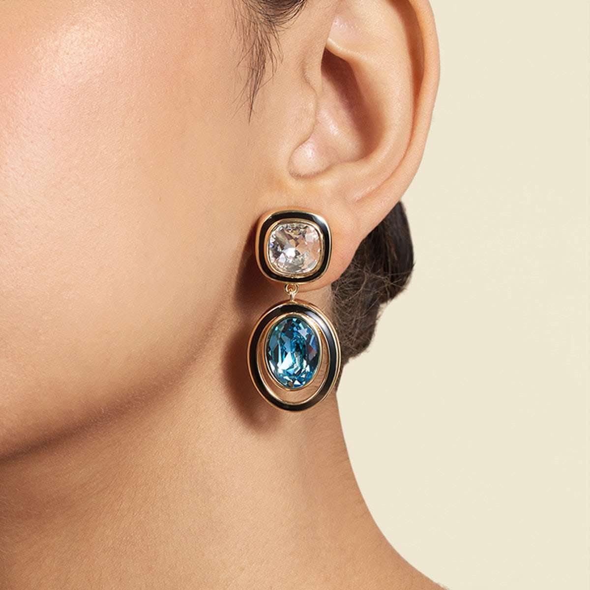 Inspired by the aquatic life, this ring is crafted in brass and plated with 18k gold. Perfect to kickstart summer dressing, this ring featuring enamel work and white and aquamarine crystals will elevate everything from breezy sun dresses to floral jumpsuits.