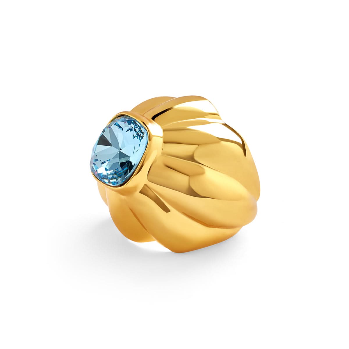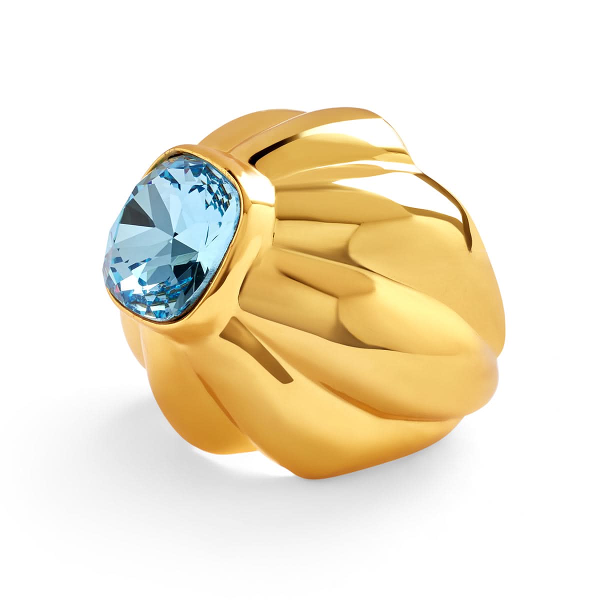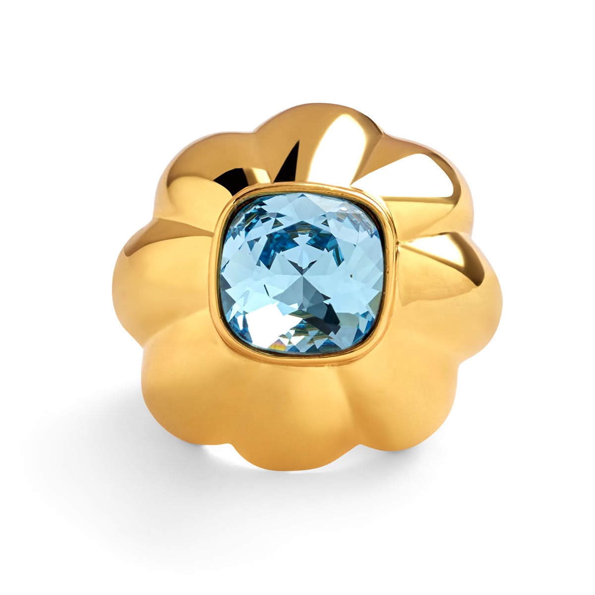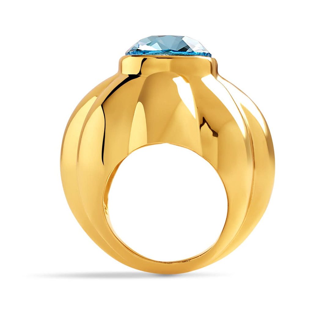 This Aqua Mood Statement Ring was designed with 18-karat gold plating and stunning blue crystal, exuding a sense of luxury and elegance. Elevate your style with this bold yet refined accessory, perfect for any occasion.