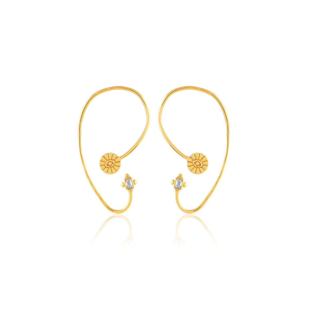 Make a bold statement with these gold-and-white ear cuffs from I For Isharya. Crafted in brass with 18k gold plating and crystal zirconia, they reimagine temple motifs as future heirlooms. Perfect for weddings, soirées, and festive nights. Shop this modern luxury now.