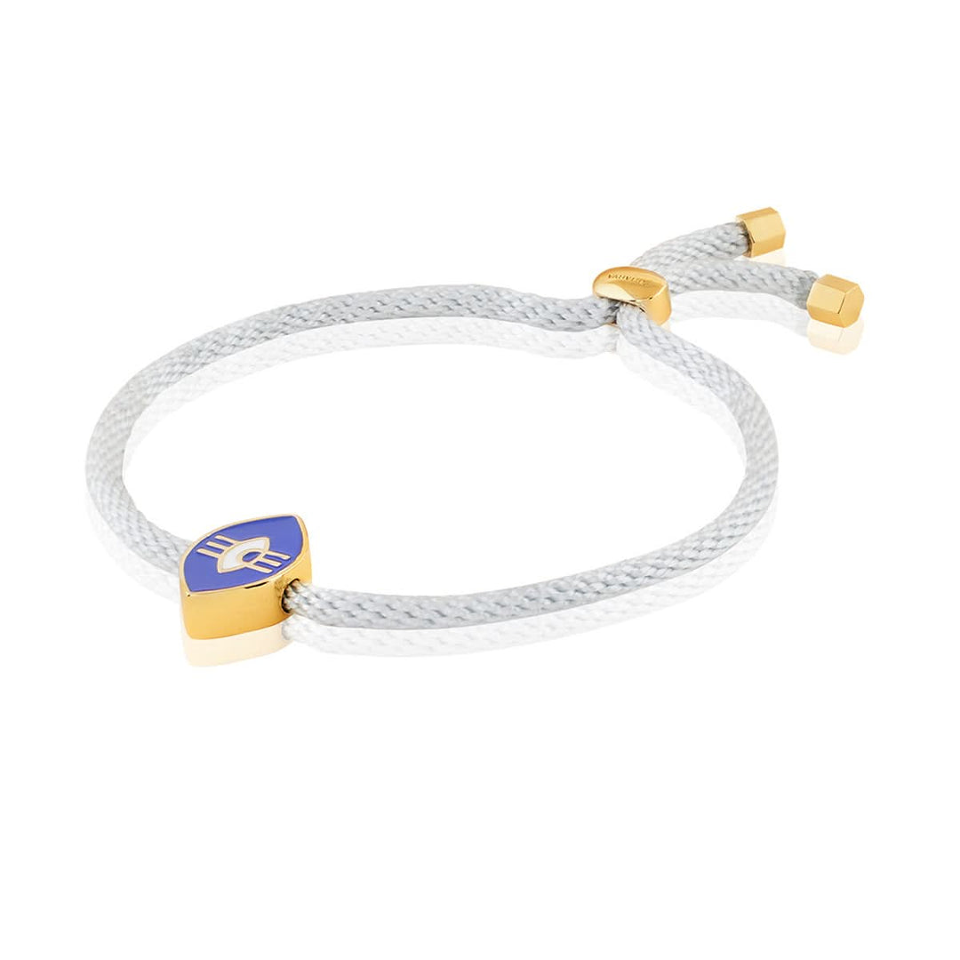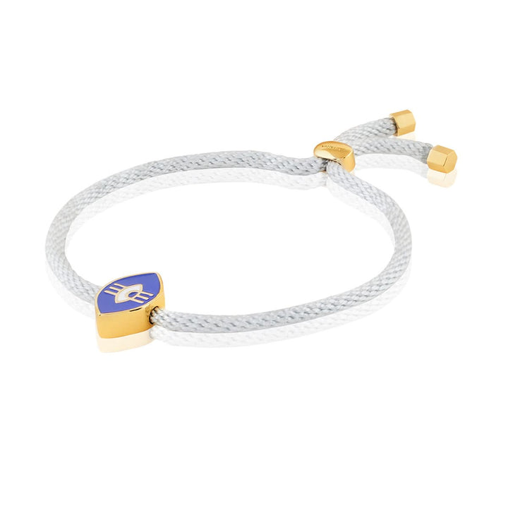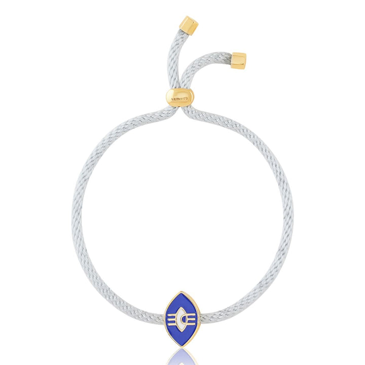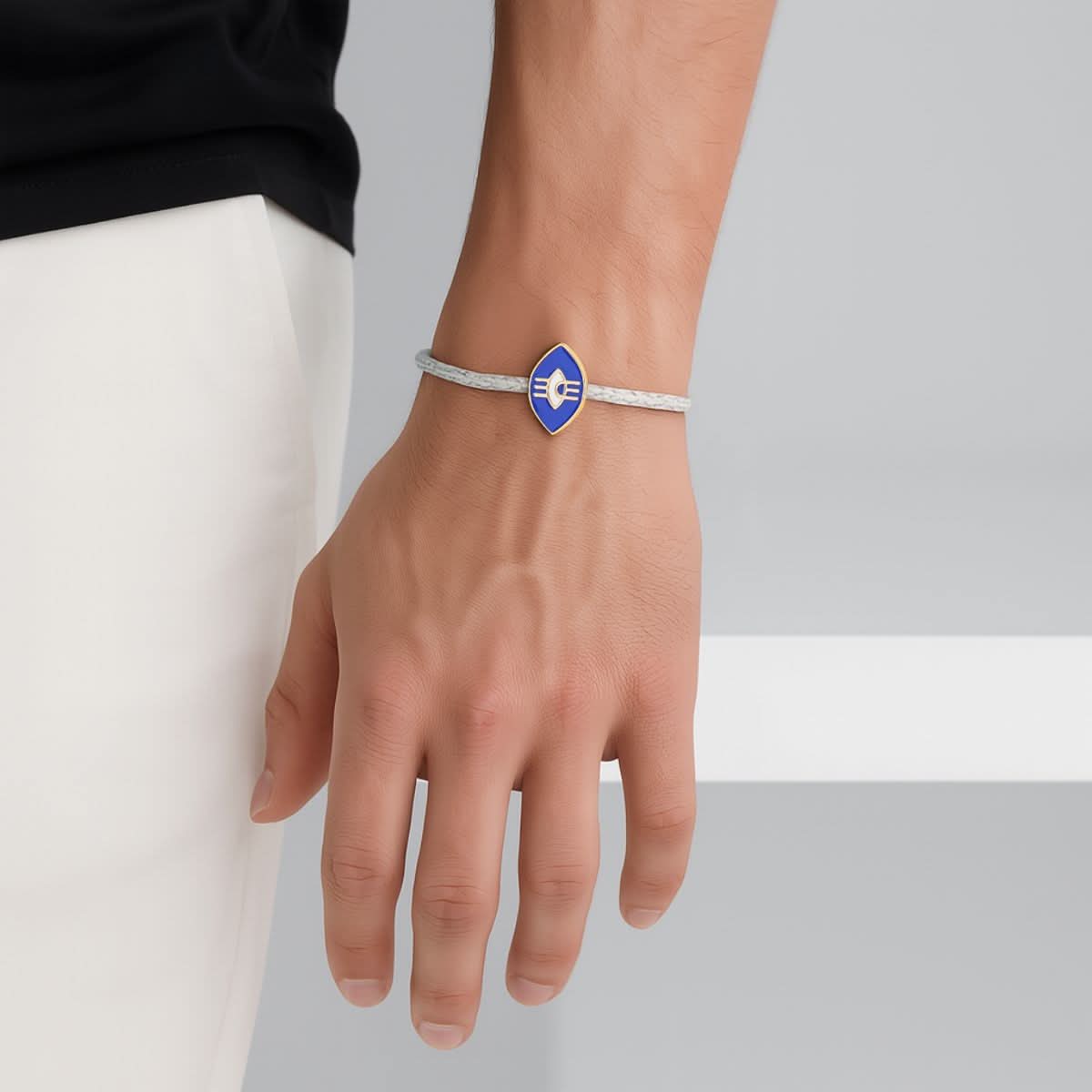 The Astra Eye Rakhi Bracelet features a striking evil eye charm in dark blue enamel on a crisp white cord, crafted in hypoallergenic, 18k gold-plated brass. A bold, spiritual piece inspired by protection and manifestation, perfect for Raksha Bandhan and beyond.