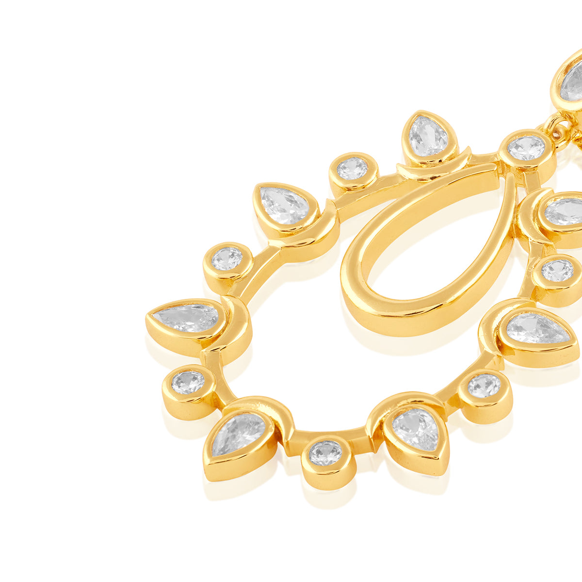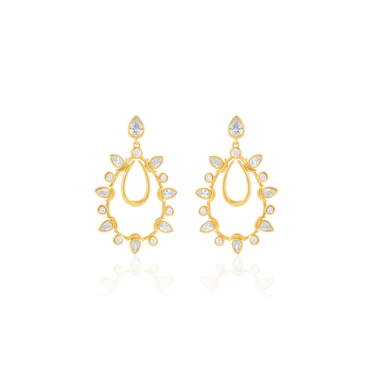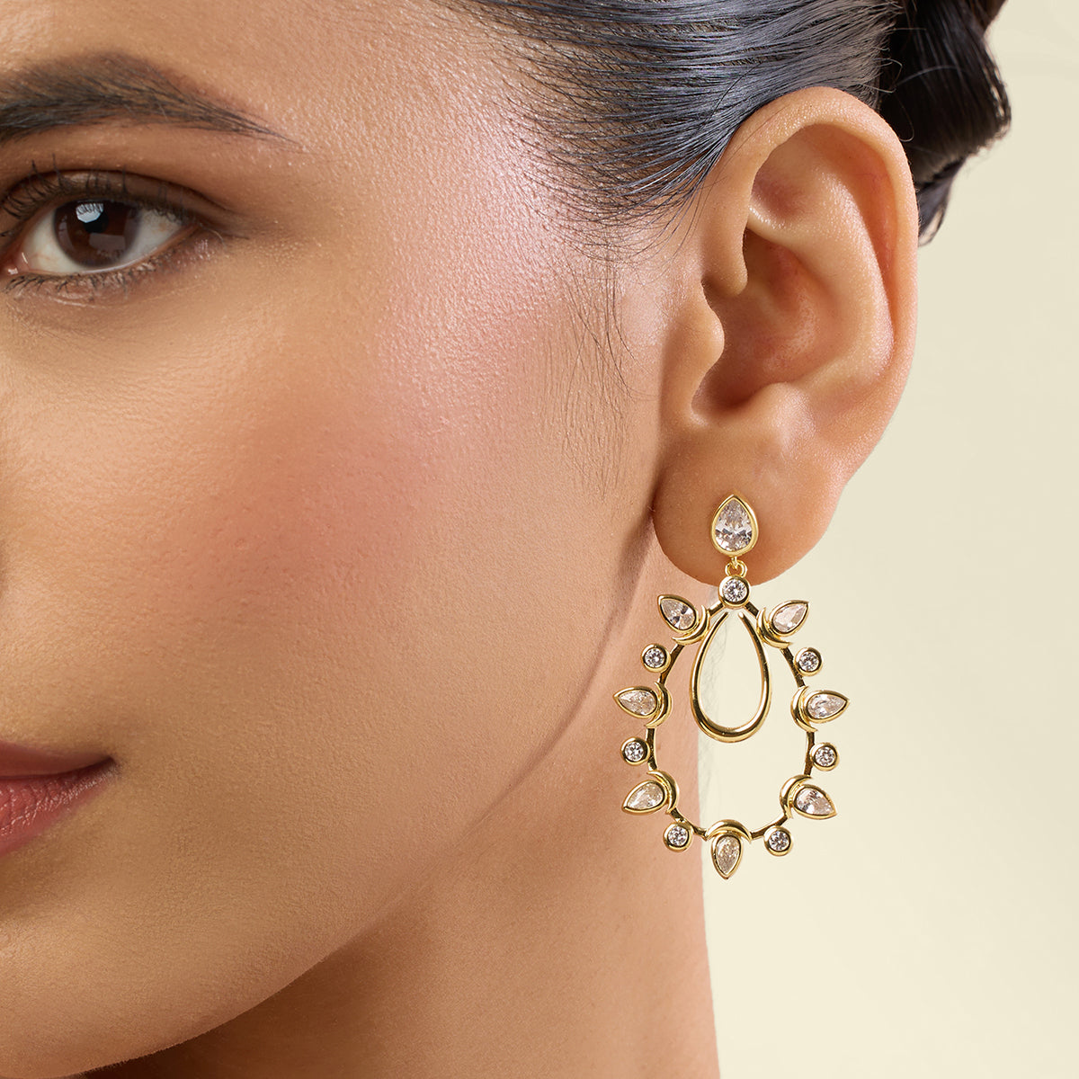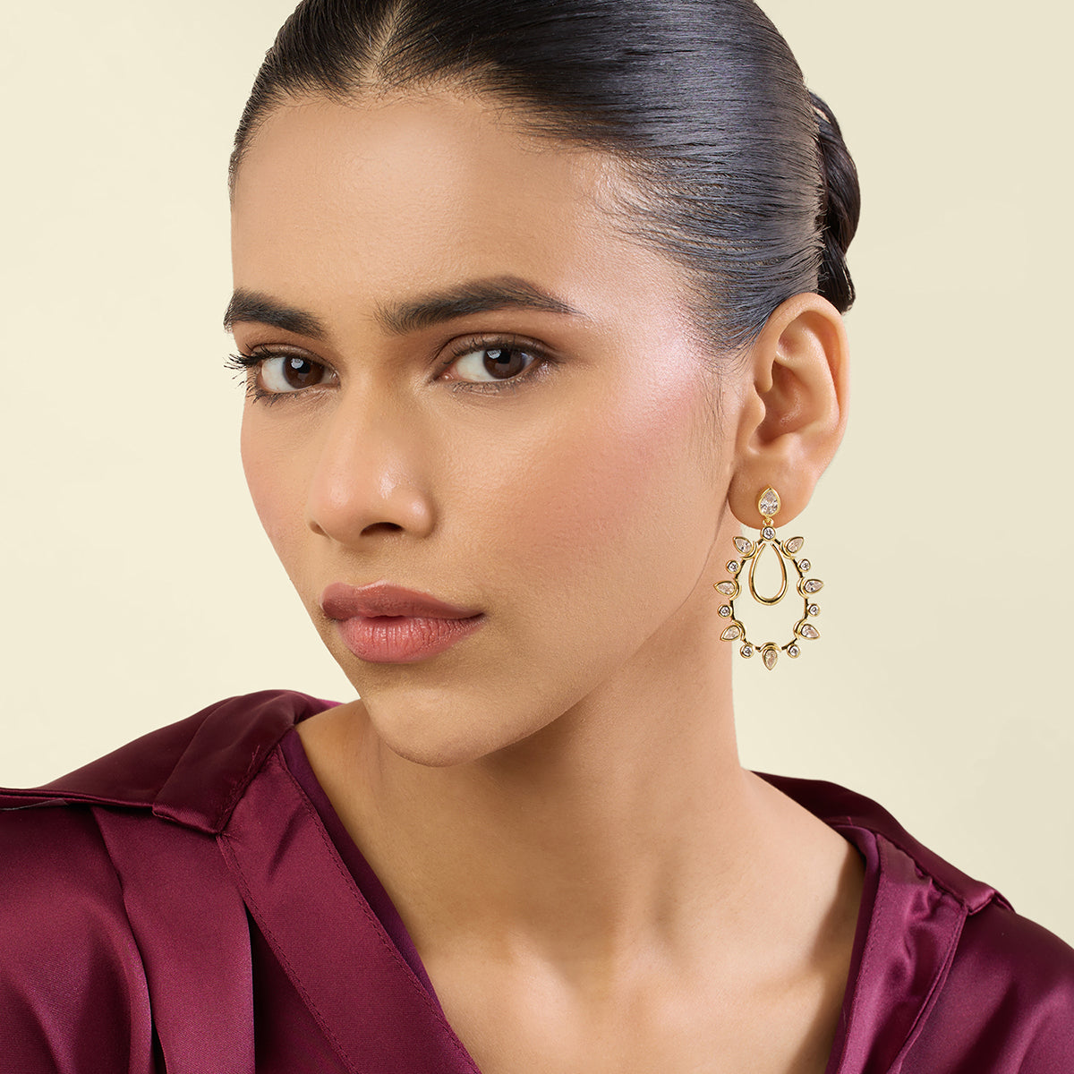 Make a bold statement with these gold-and-white chaandbaalis from I For Isharya. Crafted in brass with 18k gold plating and crystal zirconia, they reimagine temple motifs as future heirlooms. Perfect for weddings, soirées, and festive nights. Shop this modern luxury now.