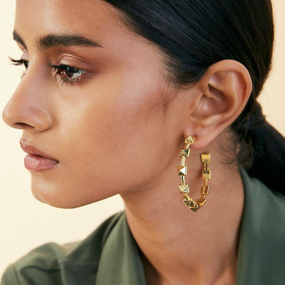 Studded pyramids on gold-plated brass hoops. Hoops go full-frontal with pyramid studs to keep it both edgy and cool. Pick your favorite gold chains to match and bring out that Rihanna in you!