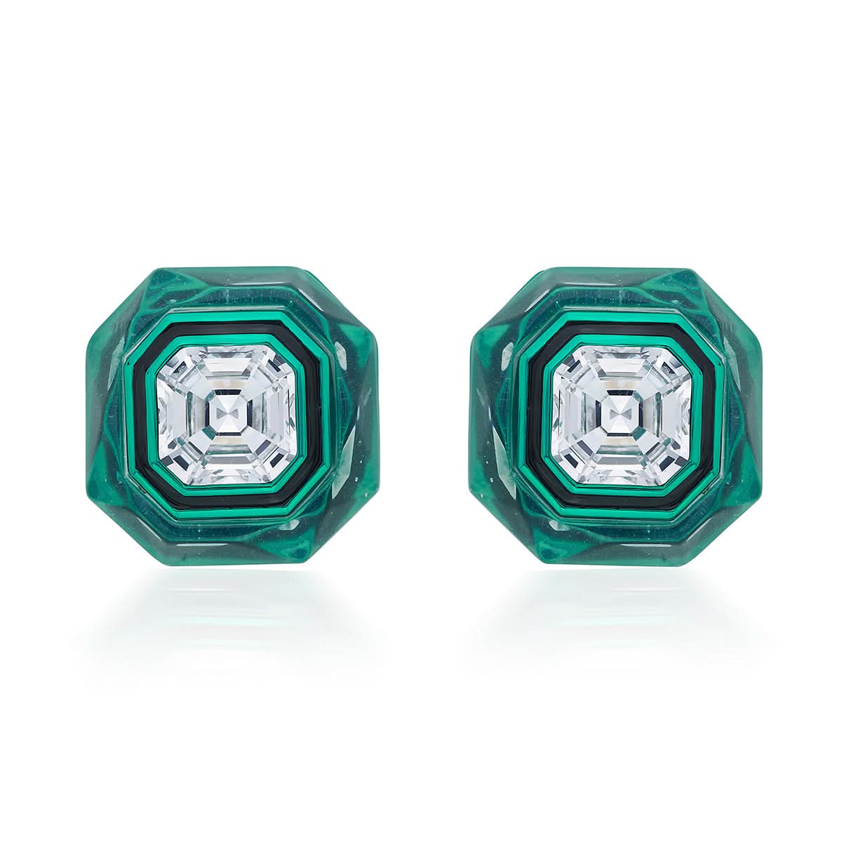These studs feature signature Isharya colored plating in green, and house a statement green crystal. Crafted from infinity cut resin, they are enhanced with beautiful enamel detailing. For the maximalist at heart, this piece screams everyday glamour.