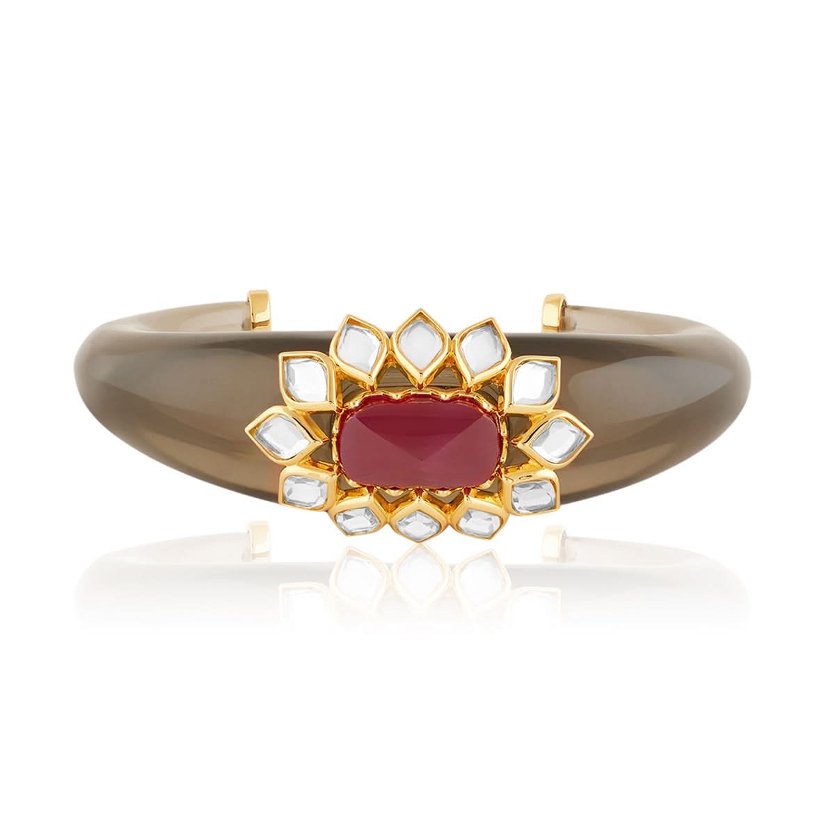 This timeless cuff is designed to make a statement. It’s crafted with 18-karat gold-plating and set with vibrant stones and our signature mirrors. Wear yours stacked with other styles from Isharya.