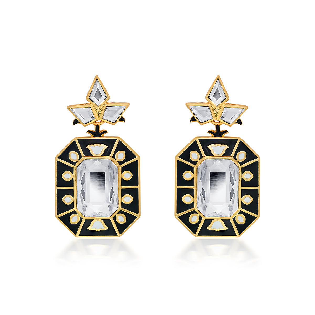 These 18K gold-plated earrings are cast from sparkling crystals, and decorated with Indian enamel work with foliole accents. Wear them for a glamorous night out.