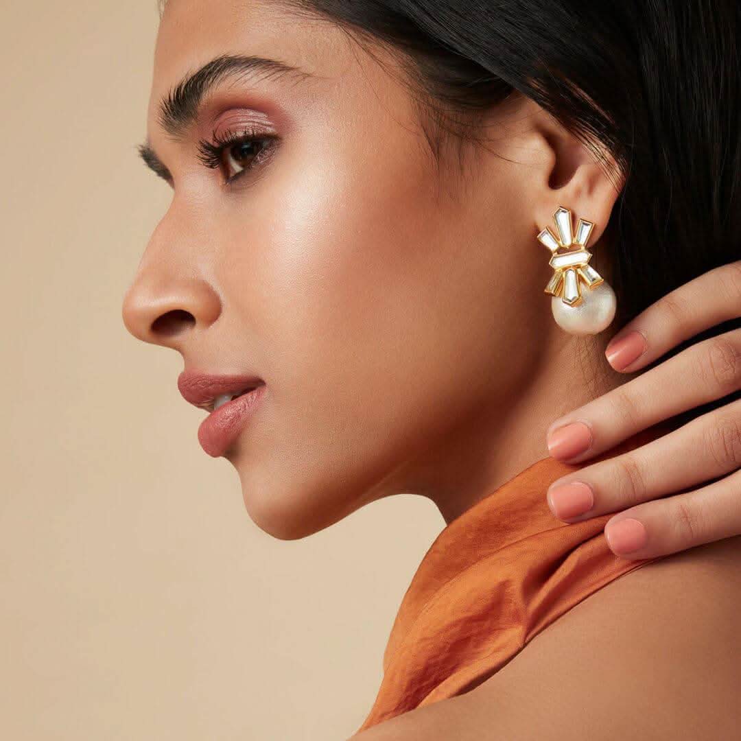 Baguette hand-cut polki mirror motif in gold-plating accented by a cotton pearl. Frame your face with the lustre of a pearl and some sparkle anytime you want to add a touch of class and sophistication.