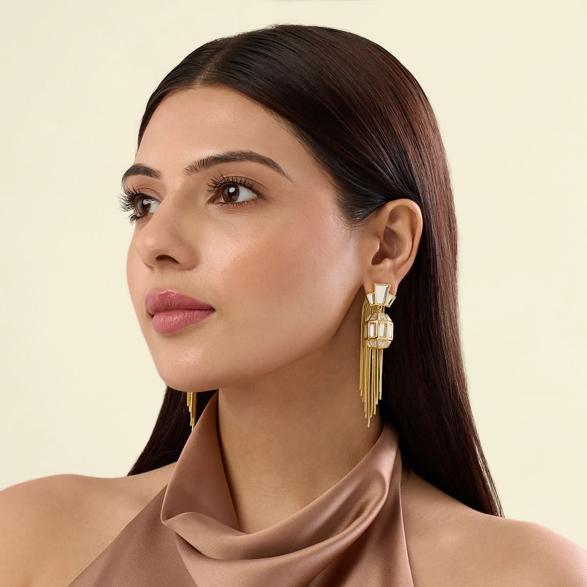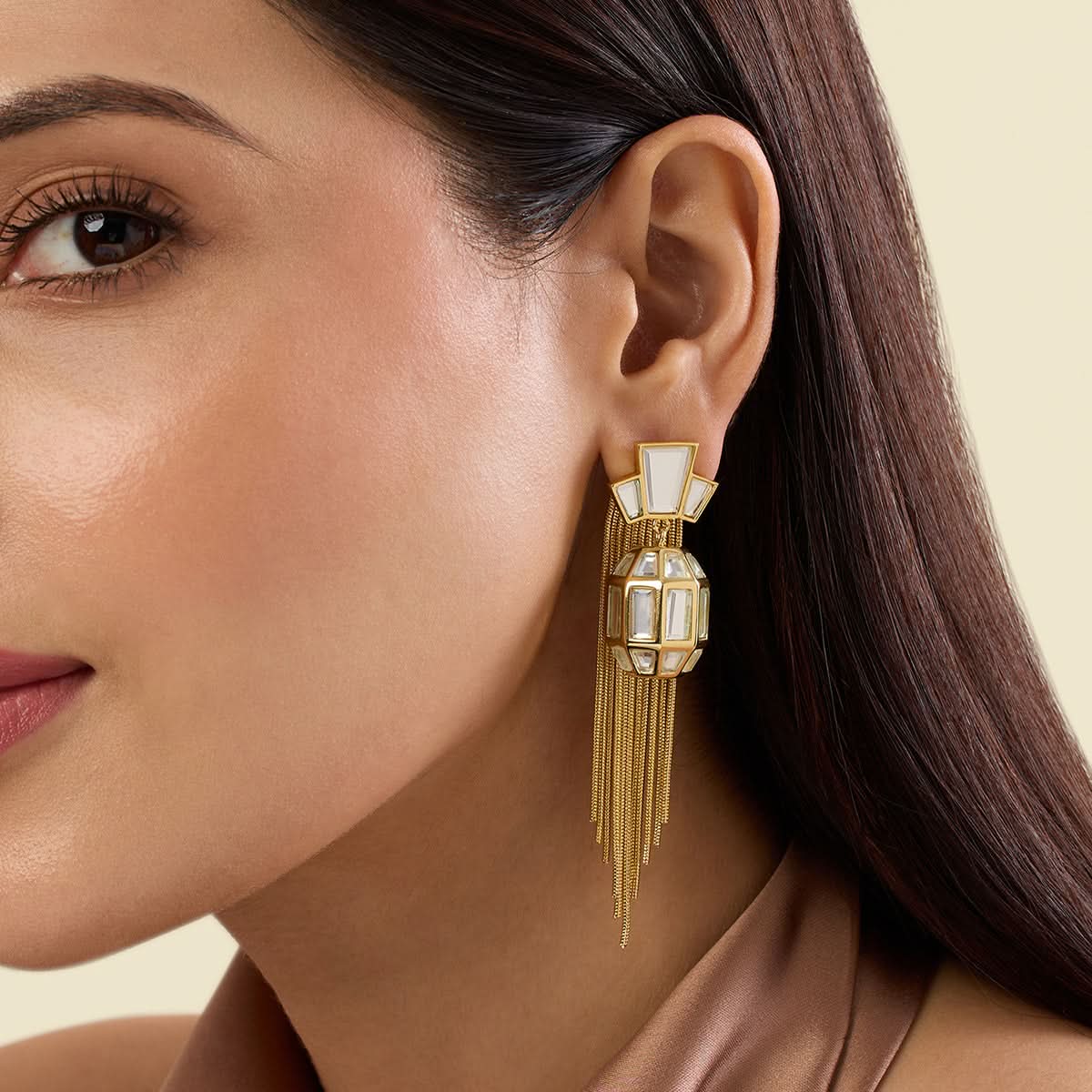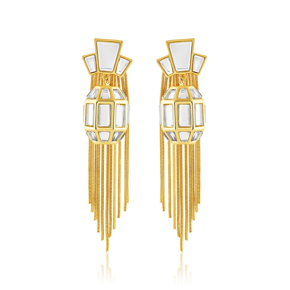 Dramatic tassel earrings with unique geometric mirror detail handcrafted with gold-plated brass. Dance and these tasseled beauties will mimic every move you make. Wear with a slim mirror choker to match.