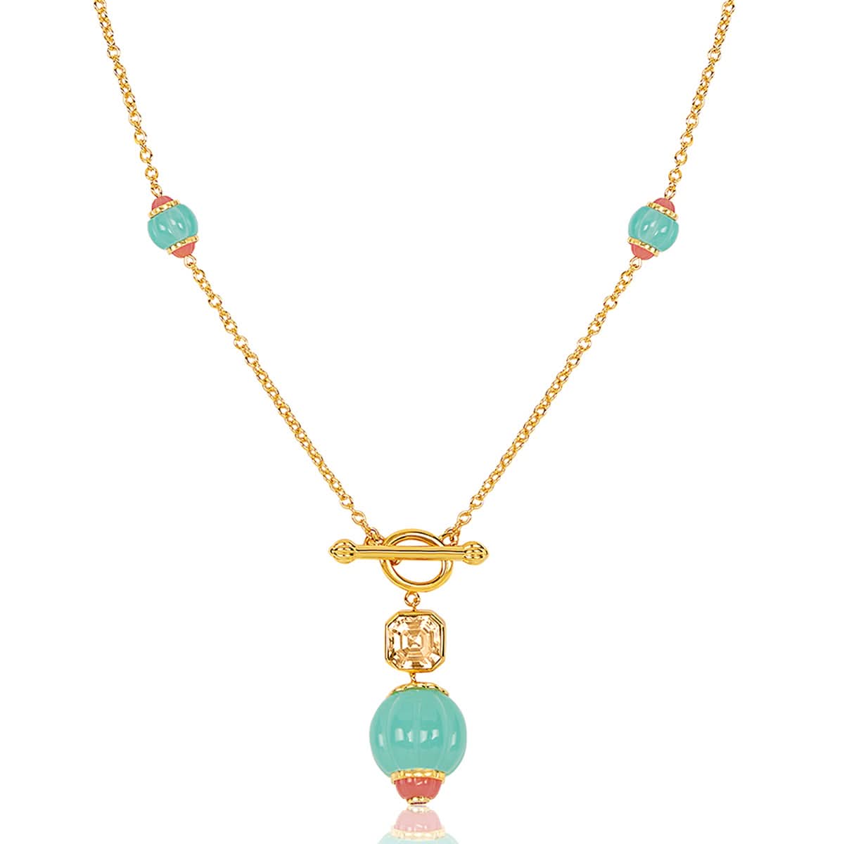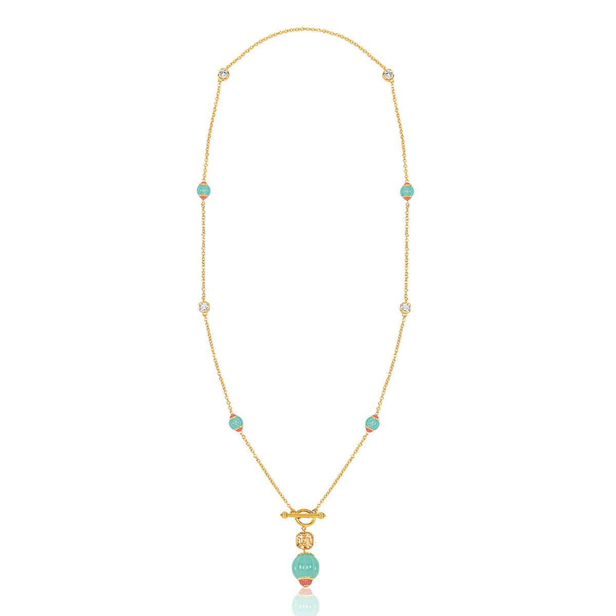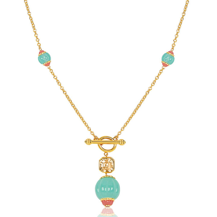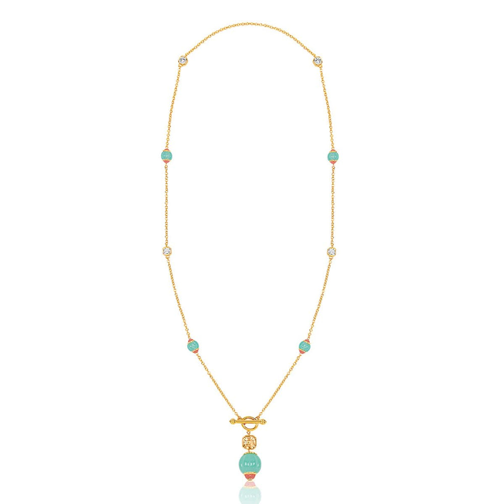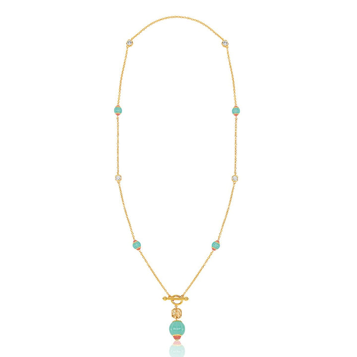 Bold and captivating, this long toggle necklace in blue, dark rose, and gold is a statement piece designed to turn heads. Crafted in 18k gold-plated brass with crystal zirconia and resin work, it’s inspired by whimsical garden motifs. Hypoallergenic and luxurious.