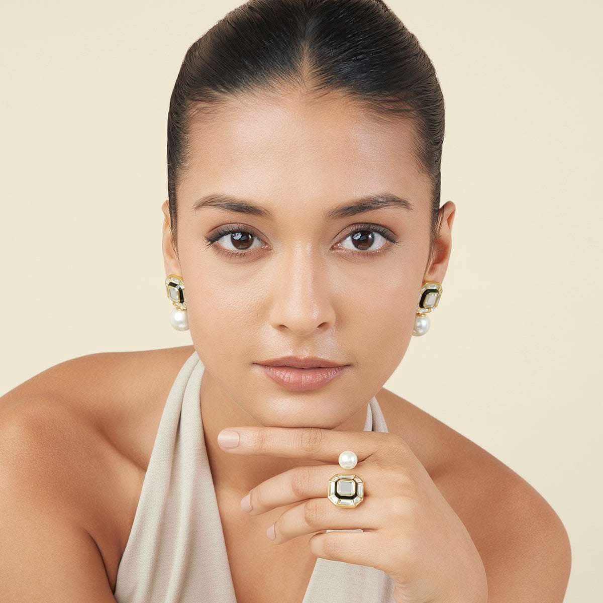 The Celestial Charm Mirror Set features bold earrings and a statement ring with hand-cut mirrors, pearl accents, and enamel detailing—all crafted in hypoallergenic, 18k gold-plated brass.