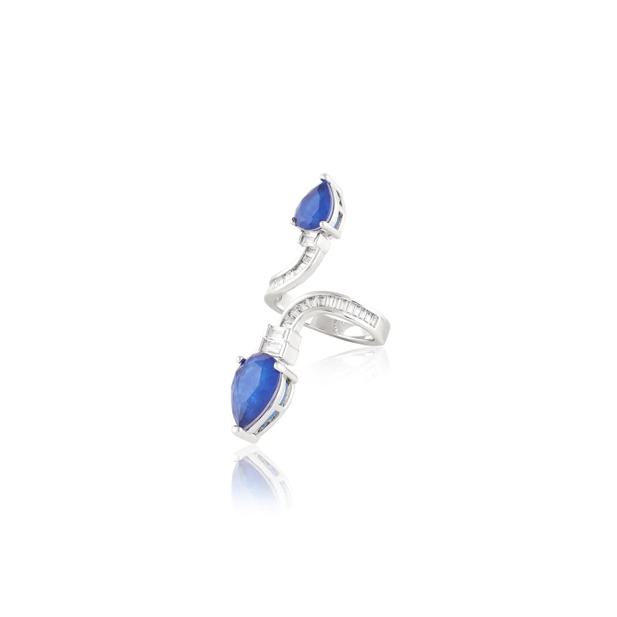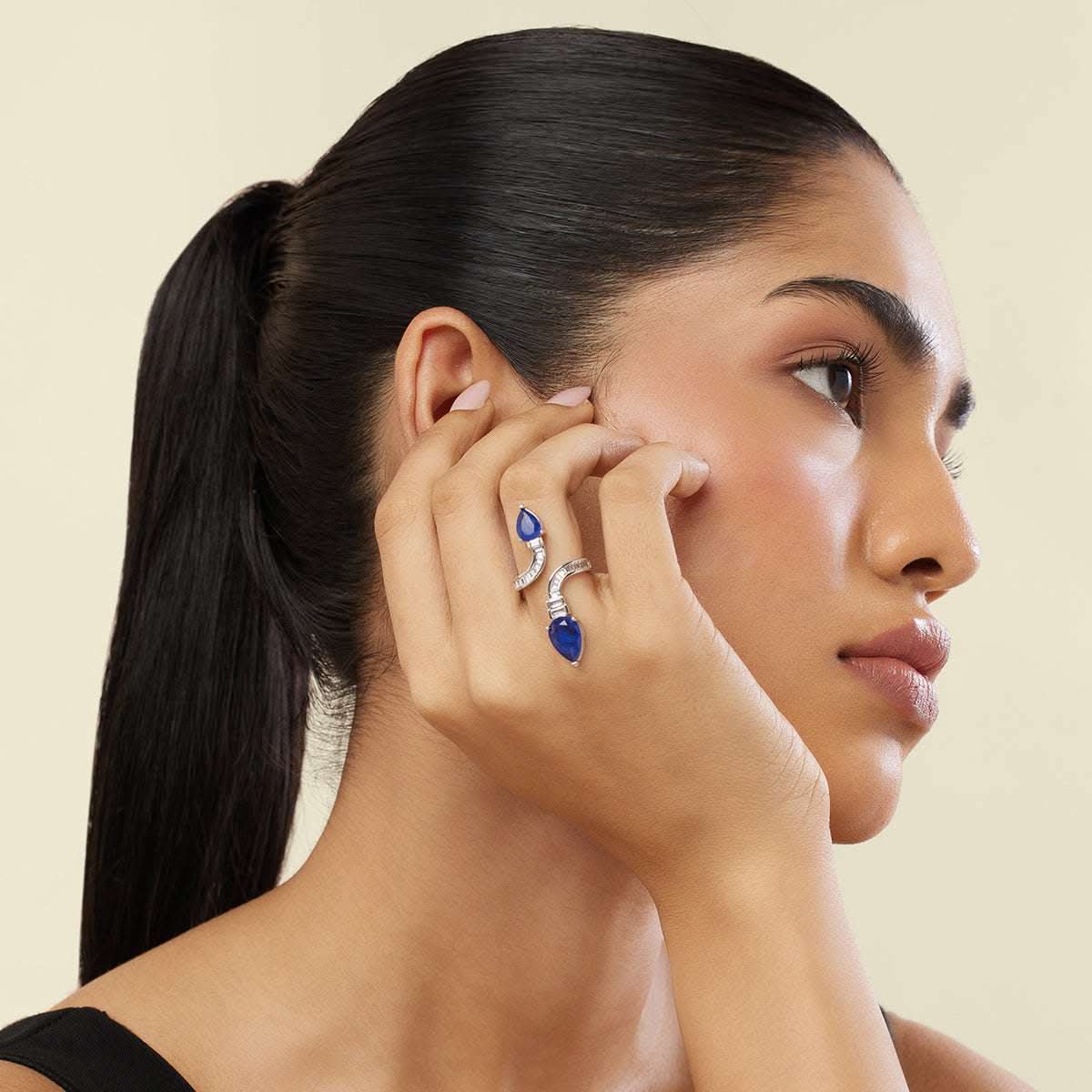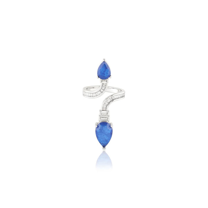 The Celestial Sapphire Statement Ring is a bold, striking piece featuring high-quality crystal zirconia and sapphire doublet stones. Crafted in rhodium-plated brass, this timeless ring is perfect for cocktail parties and festive occasions. Its elegant design embodies modern luxury.