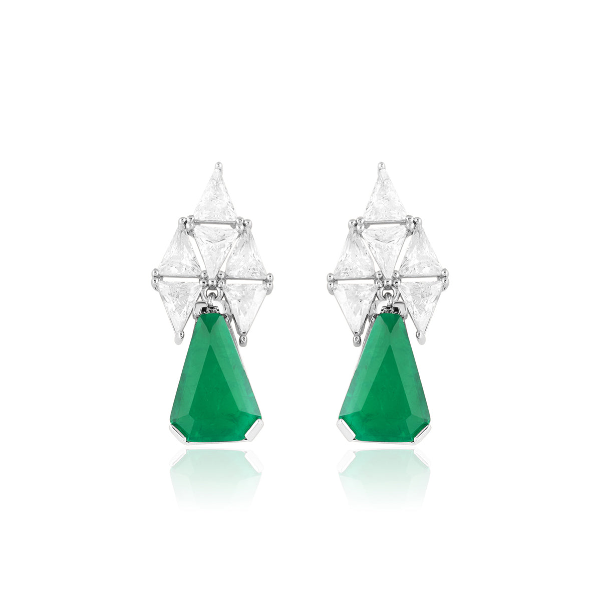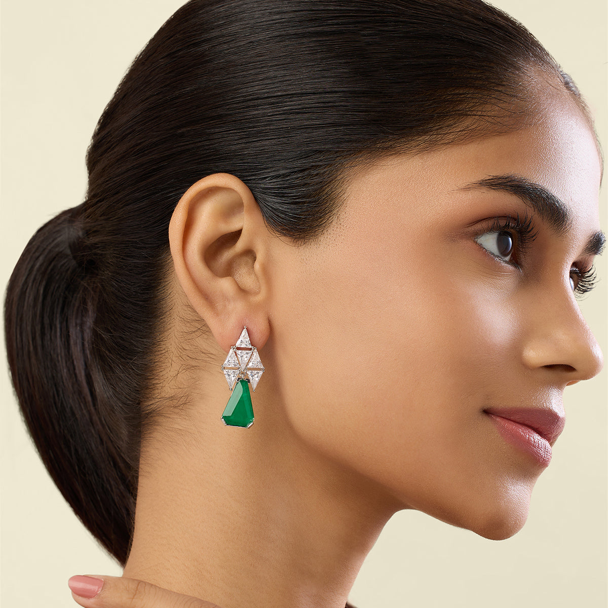 Turn heads with Isharya’s white and green earrings, featuring special-cut crystal zirconia and Botox emeralds. Crafted in brass with rhodium plating, these hypoallergenic statement earrings exude timeless glamour. Perfect for weddings, festive soirées, and cocktail nights. Shop unmatched luxury now.