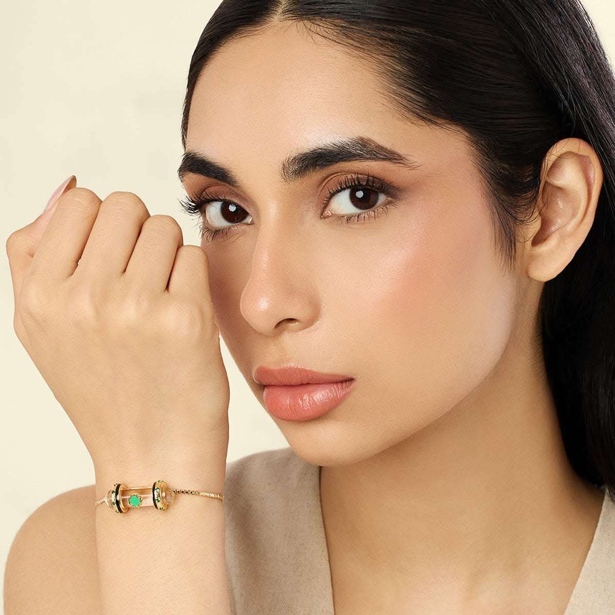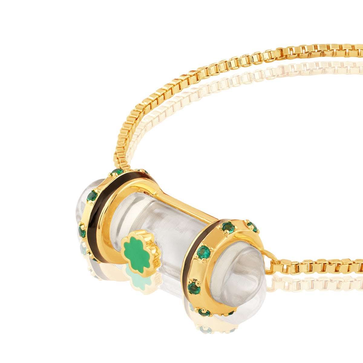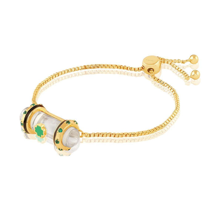 The Clarity Charm Bracelet brings together the illuminating power of clear quartz with crystal zirconia and white enamel accents, set in 18k gold-plated brass. Hypoallergenic and statement-ready, it’s the ultimate symbol of intention and elegance.