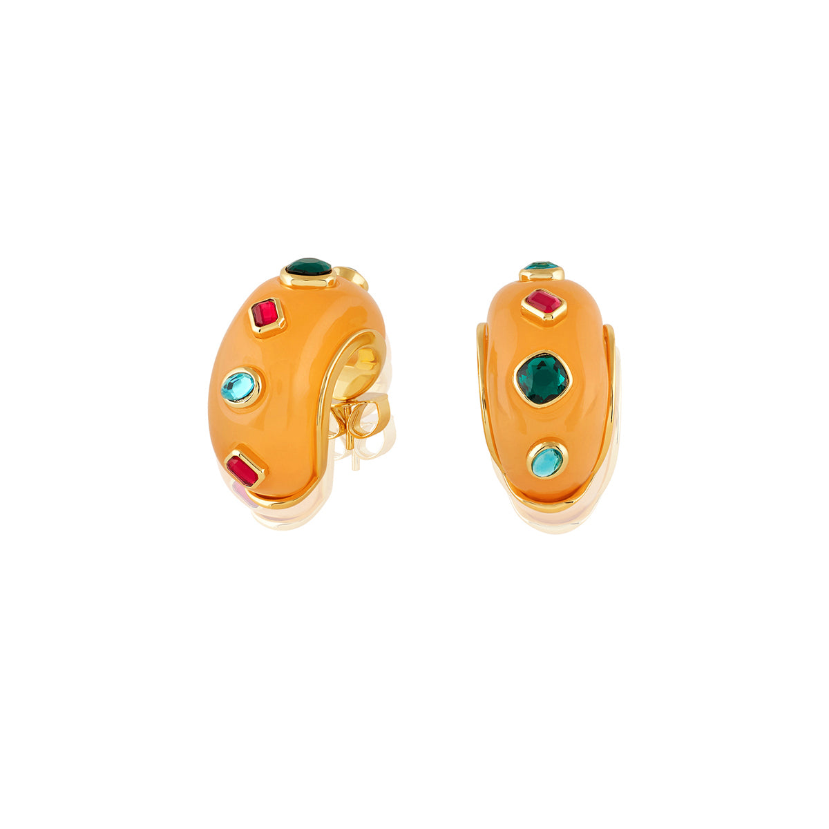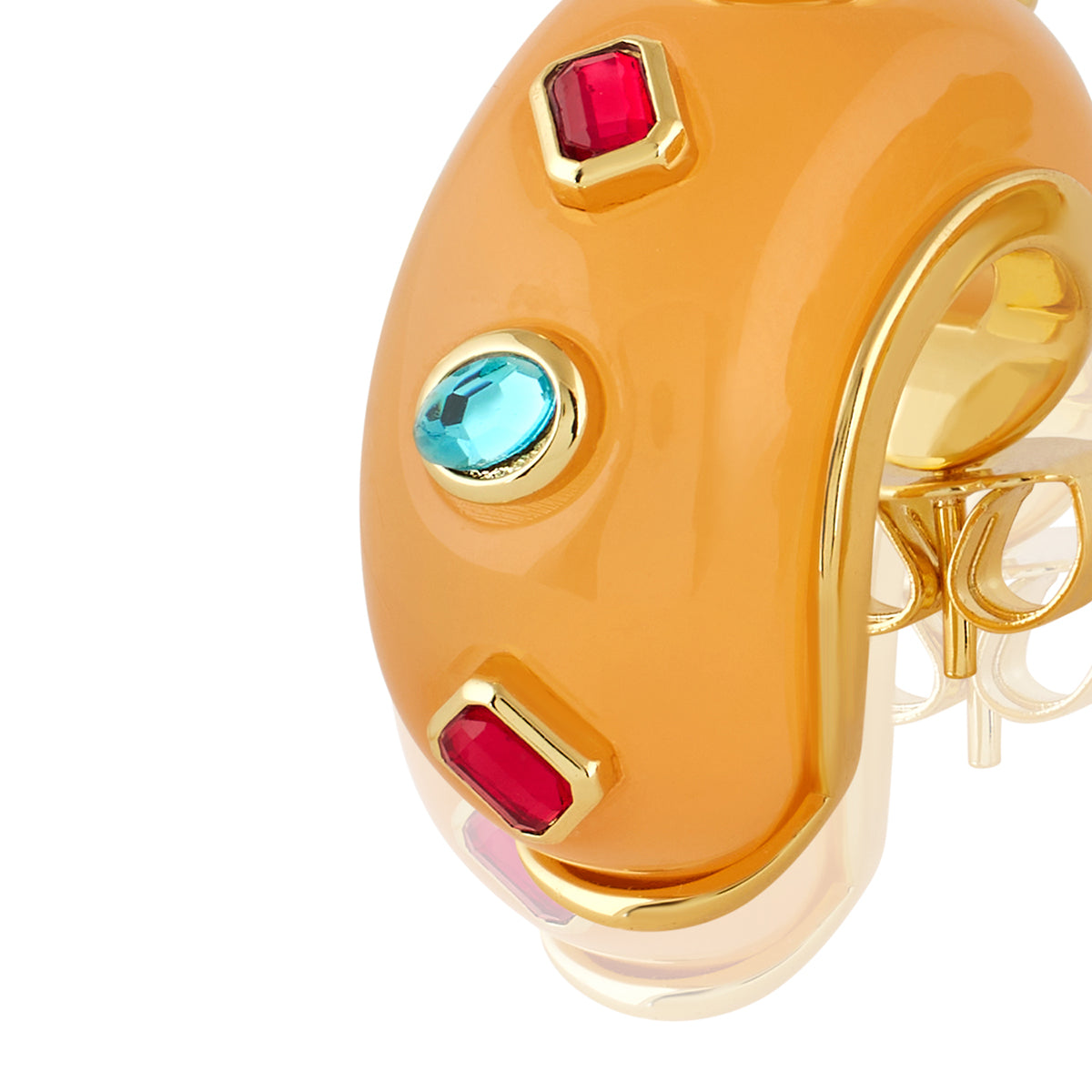 Elevate your look with this bold statement earring in orange and gold. Featuring crystal zirconia and resin work, this piece is crafted from 18k gold-plated brass and inspired by whimsical garden motifs like flowers, snails, and dragonflies. Hypoallergenic and luxurious.