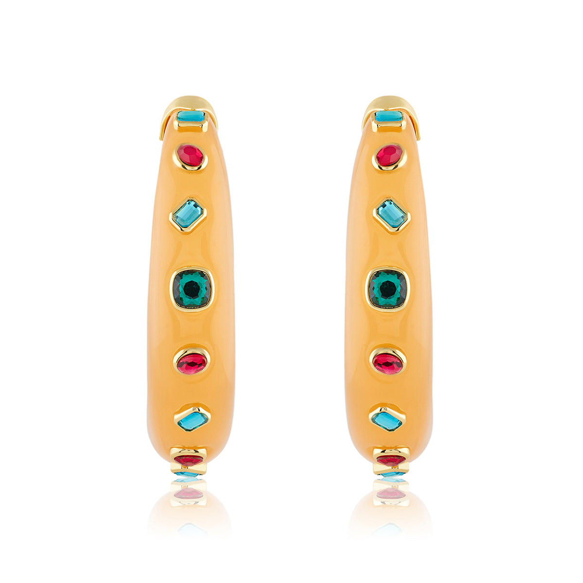 Elevate your look with this bold earring in coral and gold, featuring crystal zirconia and resin work. Crafted from 18k gold-plated brass, it draws inspiration from whimsical garden motifs like flowers and dragonflies. Hypoallergenic and luxurious.