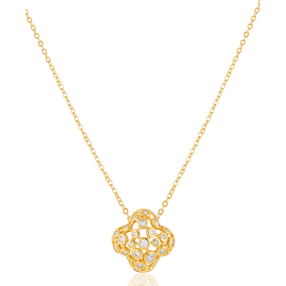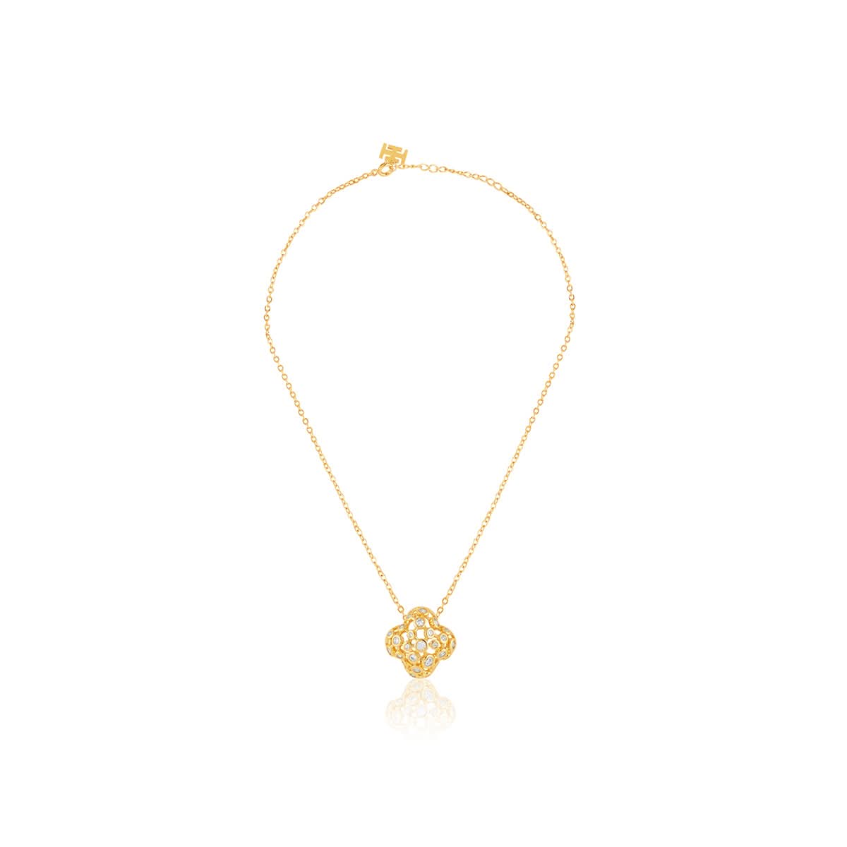 Command attention with this gold-and-white pendant necklace, adorned with crystal zirconia and intricate Portuguese-inspired filigree. Crafted in hypoallergenic brass with 18k gold plating, it’s perfect for weddings, parties, and festive nights. Shop Isharya elegance now.