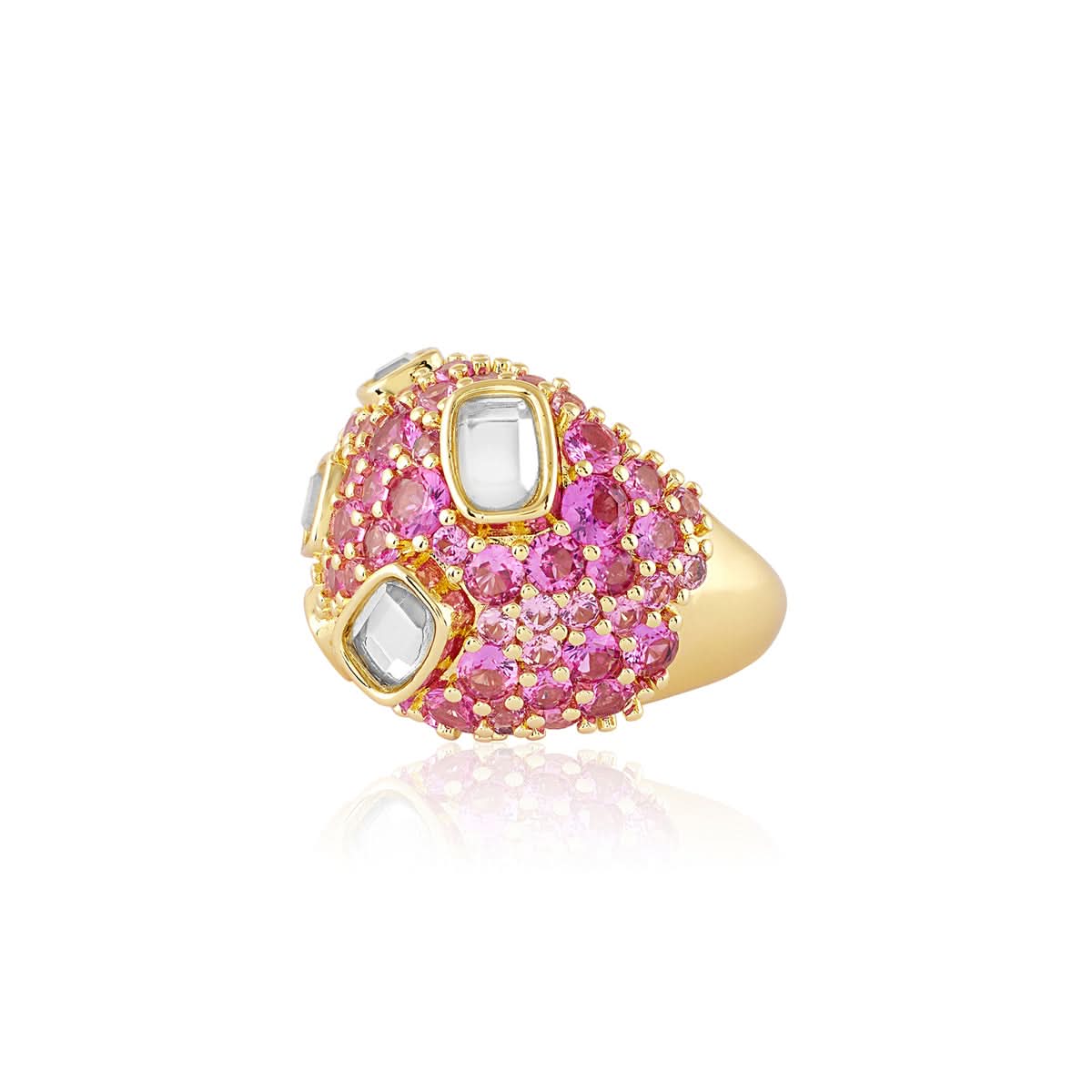 This statement ring is crafted from brass and plated with 18k gold. Inspired by intergalactic phenomenons and colour-blocking, this ring features mirror work and the best quality pink crystals making it the perfect plus-one for the party season and beyond.