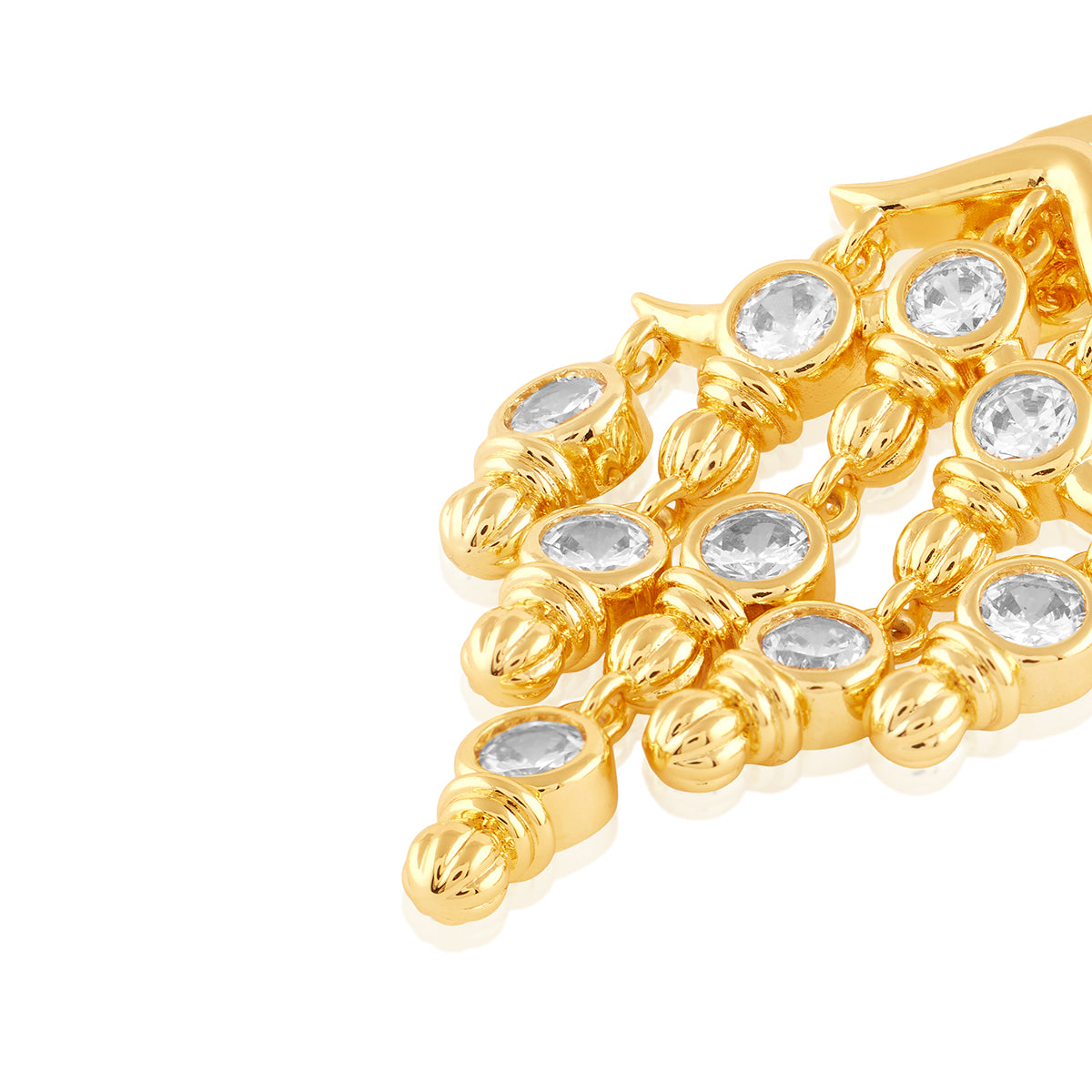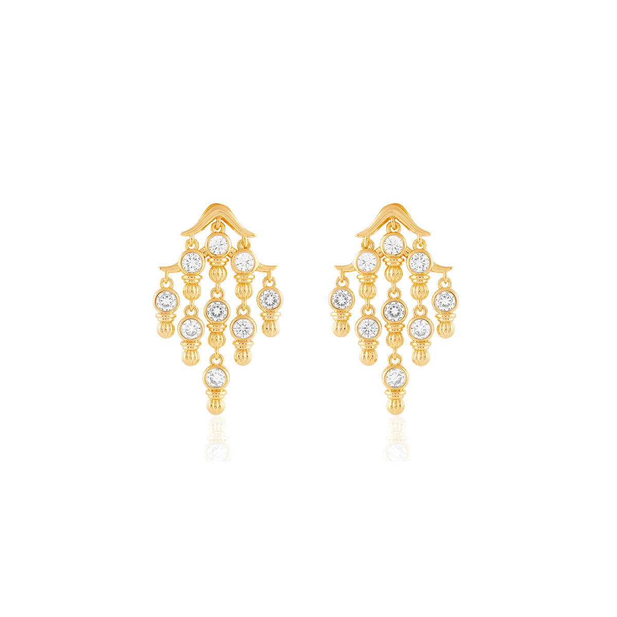 Make a bold statement with these gold-and-white chandelier from I For Isharya. Crafted in brass with 18k gold plating and crystal zirconia, they reimagine temple motifs as future heirlooms. Perfect for weddings, soirées, and festive nights. Shop this modern luxury now.