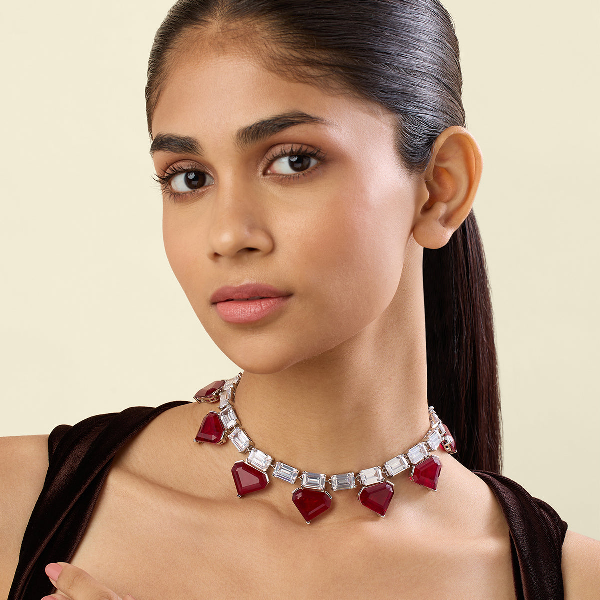 Inspired by the Art Deco era, this white and red necklace stuns with crystal zirconia and Botox rubies. A rhodium-plated brass masterpiece, hypoallergenic and luxe—ideal for cocktail nights and celebrations. Own your statement look today.