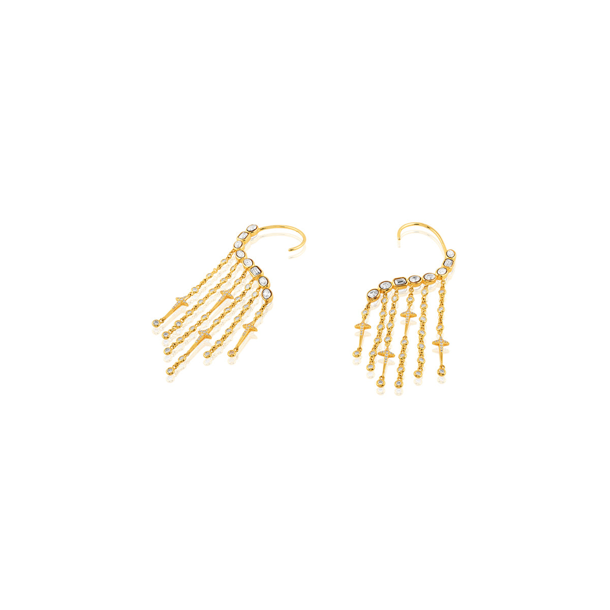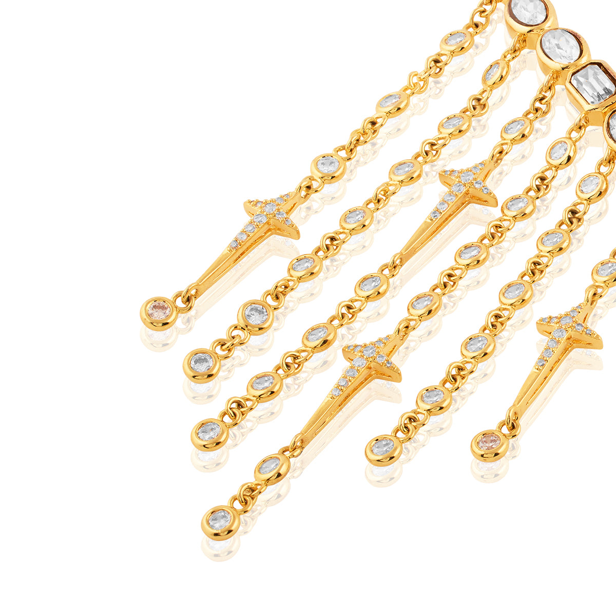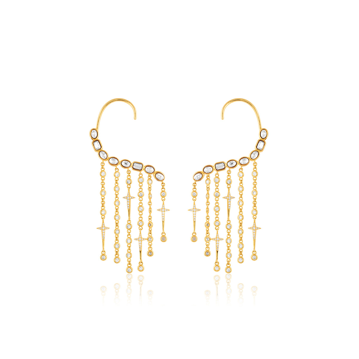 lluminate every occasion with these statement earrings, crafted in brass with 18k gold plating. Featuring crystal zirconia stones, they echo cosmic constellations and ancient symbolism. Perfect for weddings, cocktails, and festive nights.