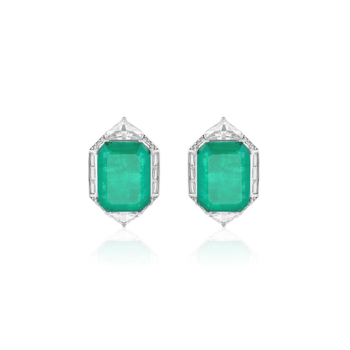 Elevate your every look with our Double Emerald Statement Studs. These elegant studs feature CZ and Doublet Dark Emerald stone, set in brass and plated with rhodium for a luxurious finish. Perfect for any occasion, these Art Deco-inspired stud earrings will elevate your style for every reason and season.