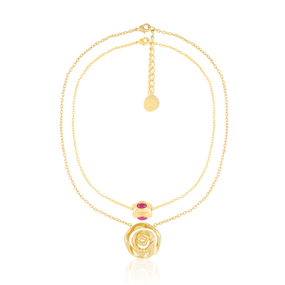 This vintage-inspired Double Rosé Layered Necklace is crafted in brass and plated with 18k gold. It features exquisite mirror work and chain link detailing with a statement rose pendant. Style it with everything from heirloom sarees to cocktail dresses for every celebration.