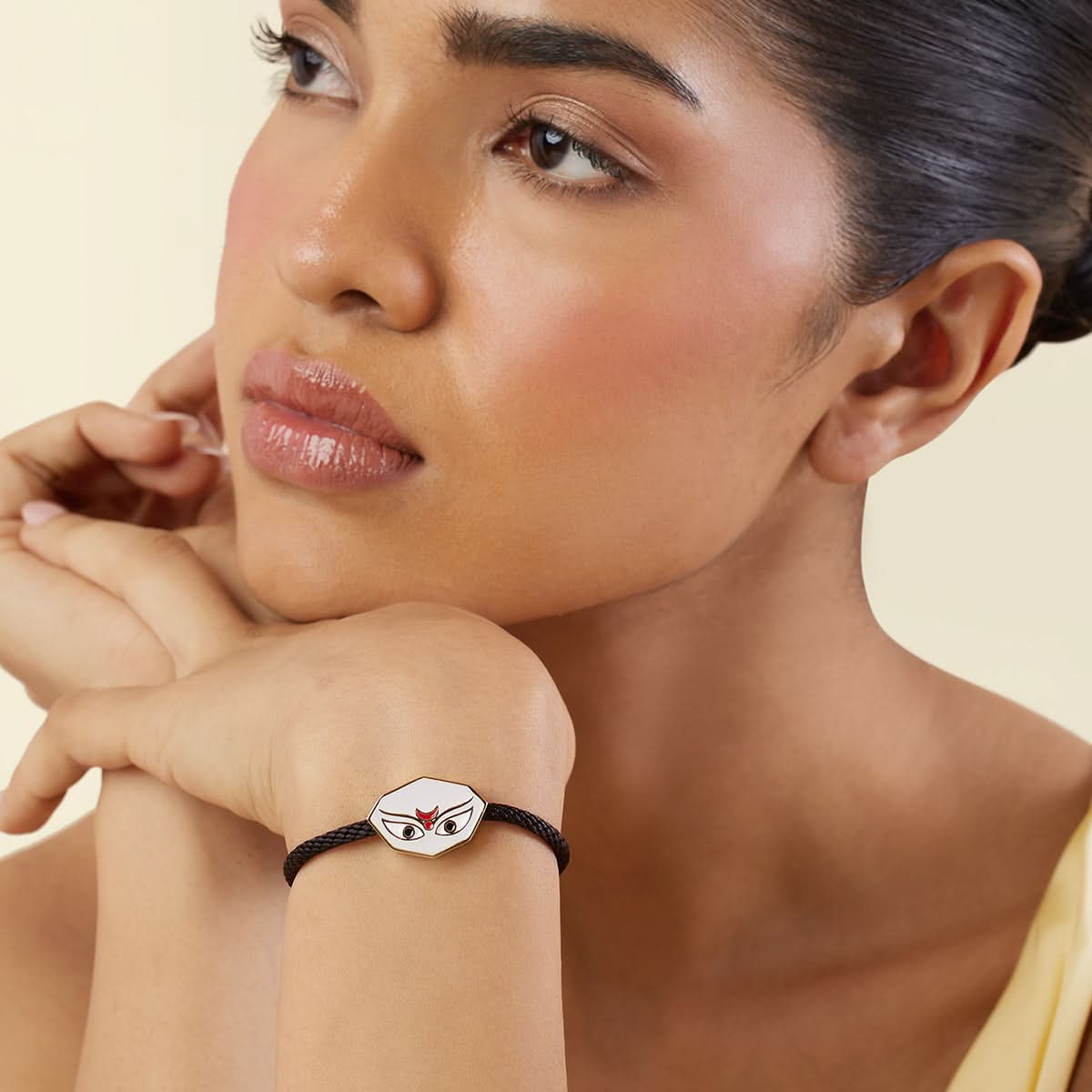 The Durga Rakhi Bracelet features a bold goddess motif in red and yellow enamel on a red cord, crafted in hypoallergenic, 18k gold-plated brass. A powerful piece of protection and presence, perfect for Raksha Bandhan and everyday empowerment.