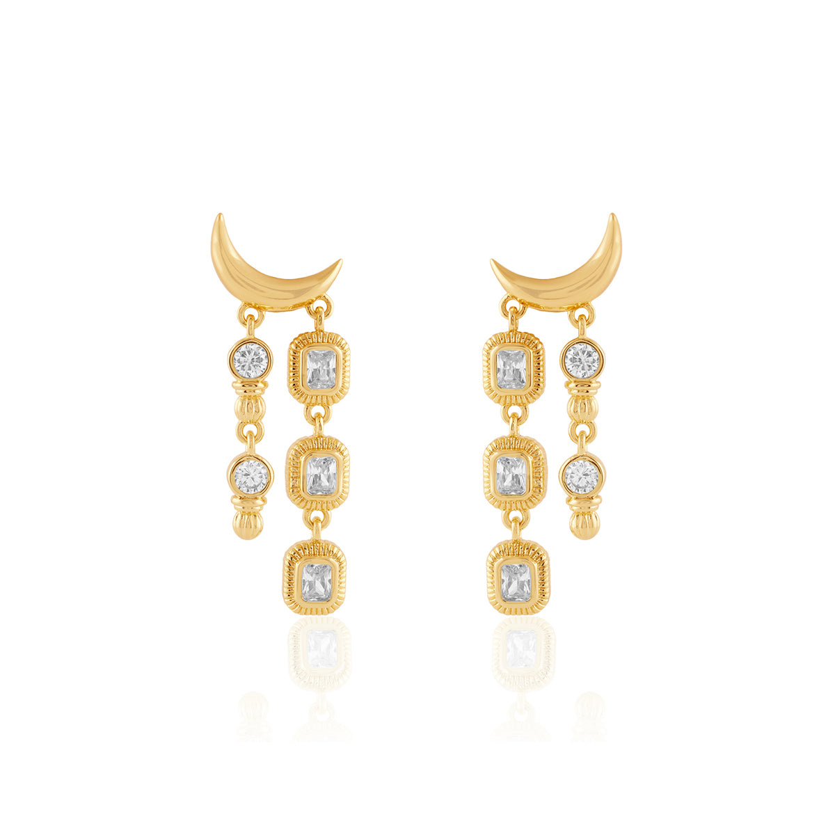 Make a bold statement with these gold-and-white danglers from I For Isharya. Crafted in brass with 18k gold plating and crystal zirconia, they reimagine temple motifs as future heirlooms. Perfect for weddings, soirées, and festive nights. Shop this modern luxury now.