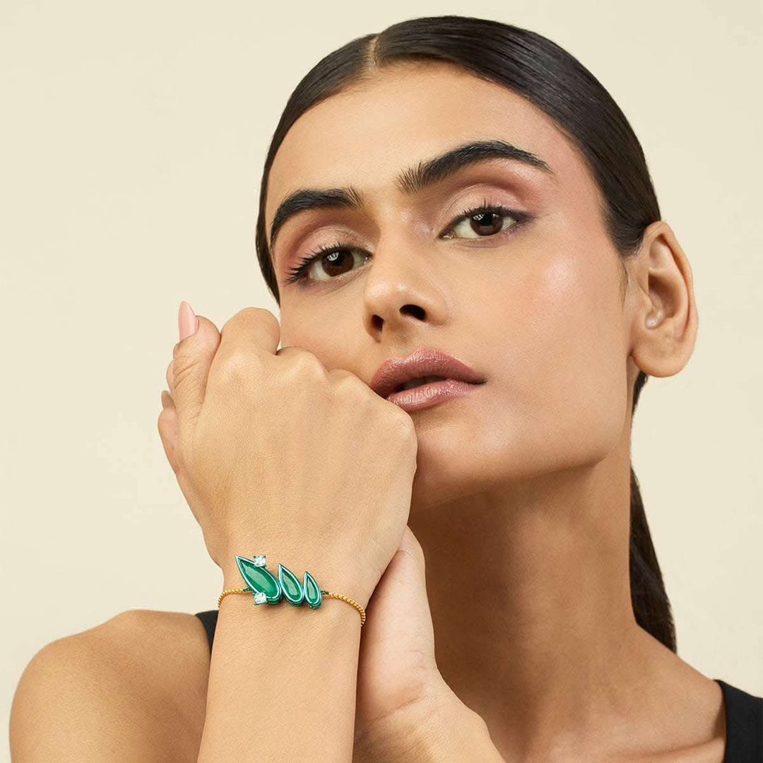 This vintage-inspired Emerald Flame Bolo Bracelet is crafted in brass and plated with 18k gold. It features exquisite green doublet and CZ stones. Wear it lone or layered with everything from heirloom sarees to cocktail dresses for every celebration.