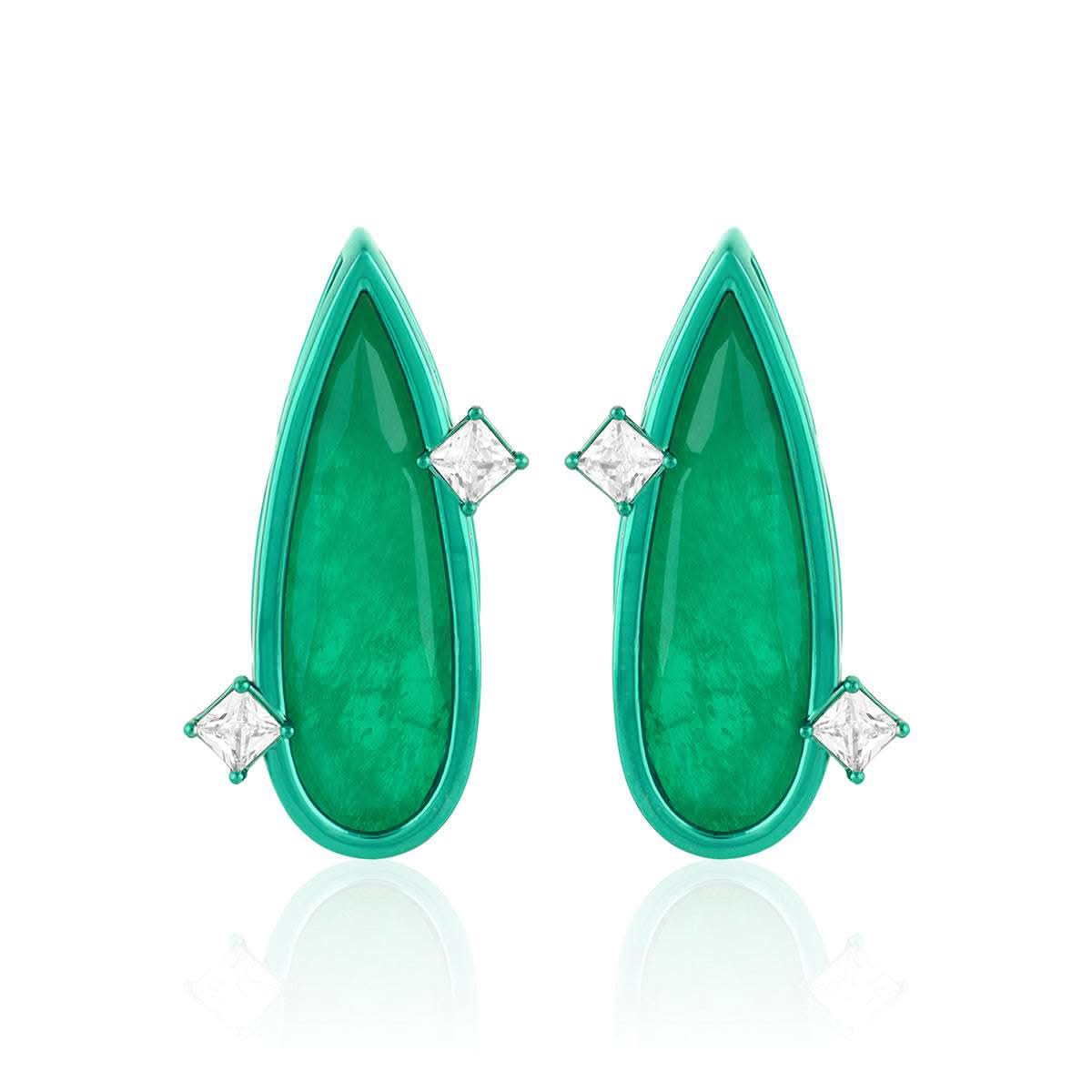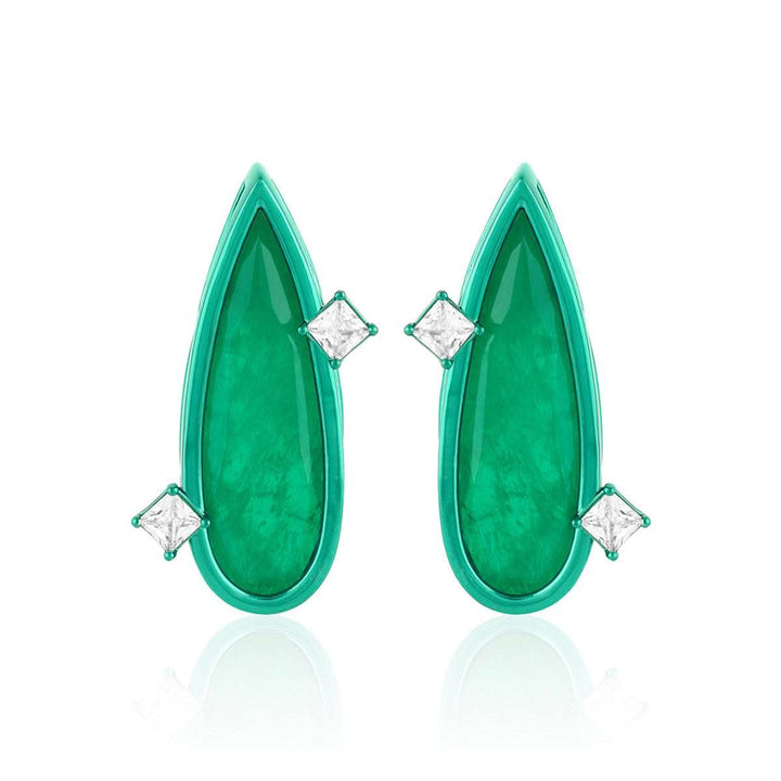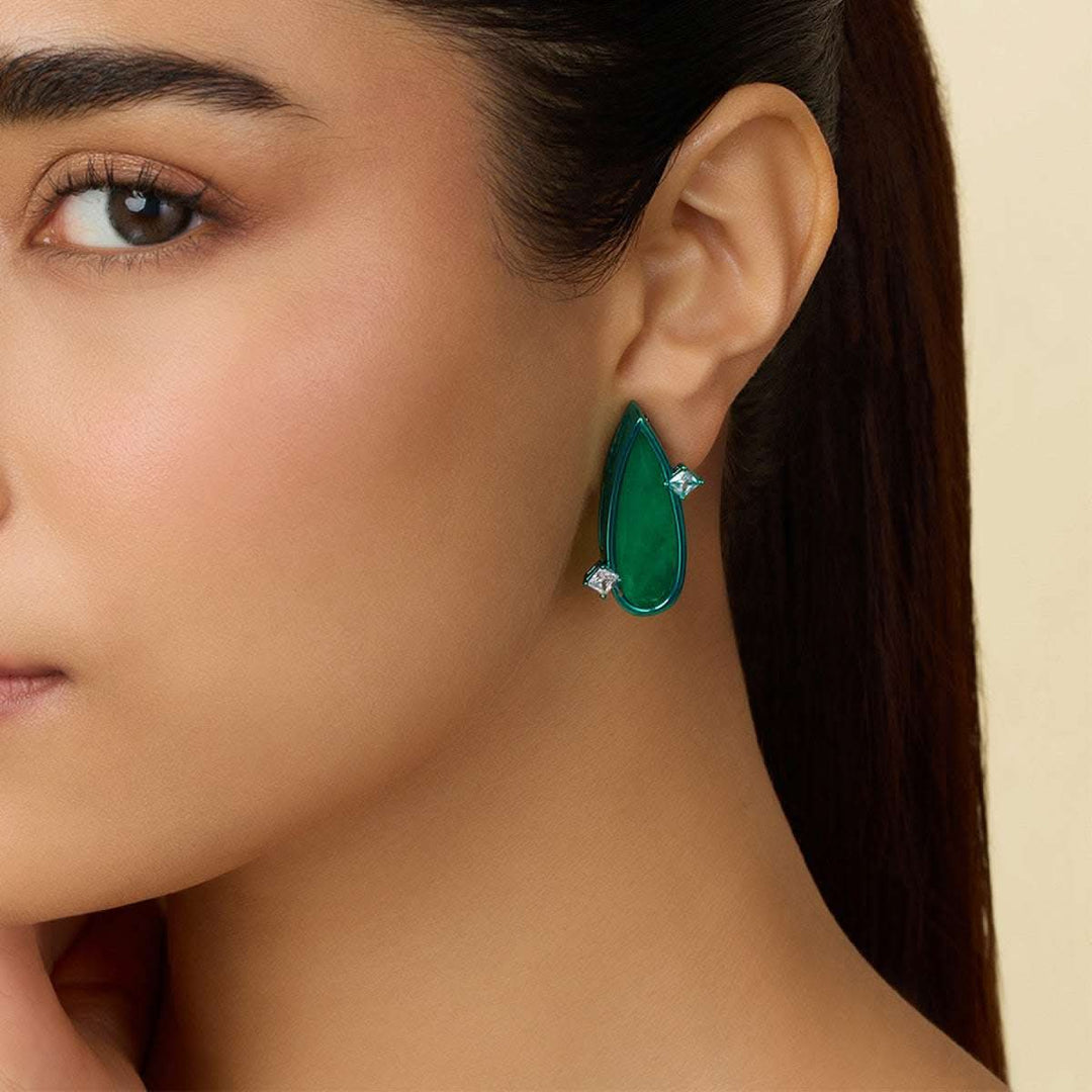 These vintage-inspired Emerald Flame Stud earrings are crafted in brass and plated with 18k gold. They feature exquisite green doublet CZ stones in a statement silhouette. Style them with everything from heirloom sarees to cocktail dresses for every celebration.