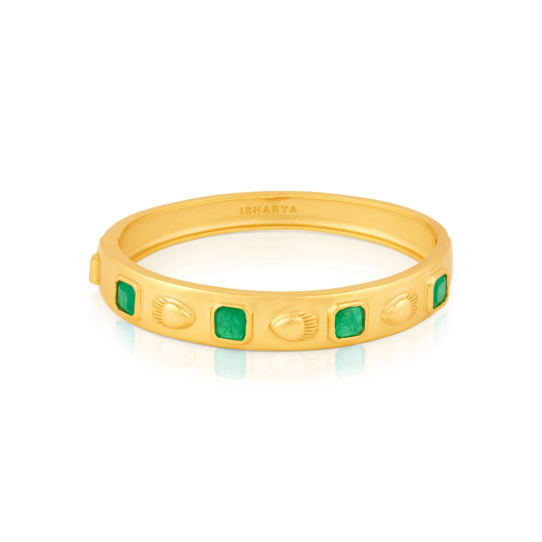 This vintage-inspired Emerald Oval Hinge Bangle is crafted in brass and plated with 18k gold. It features exquisite green doublet CZ stones and auspicious fish motifs in a statement silhouette. Wear it lone or layered with everything from heirloom sarees to cocktail dresses for every celebration.