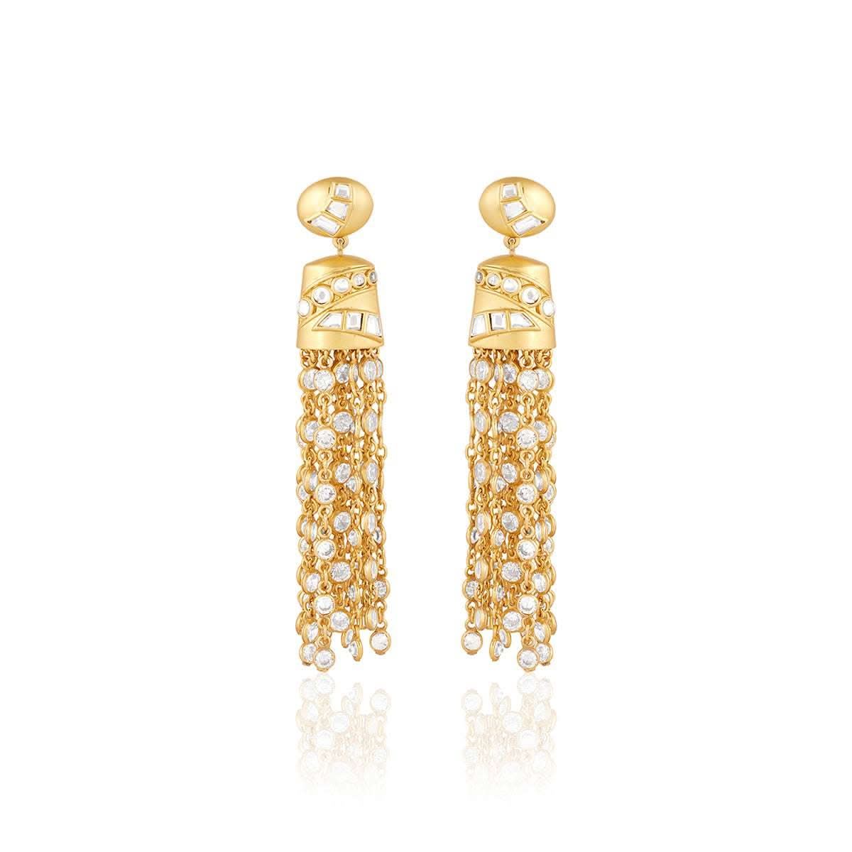 These vintage-inspired Emerald Tassels Earrings are crafted in brass and plated with 18k gold. They feature exquisite mirror work and green beads with pearl tassels. They can be styled with everything from heirloom sarees to cocktail dresses for every celebration.