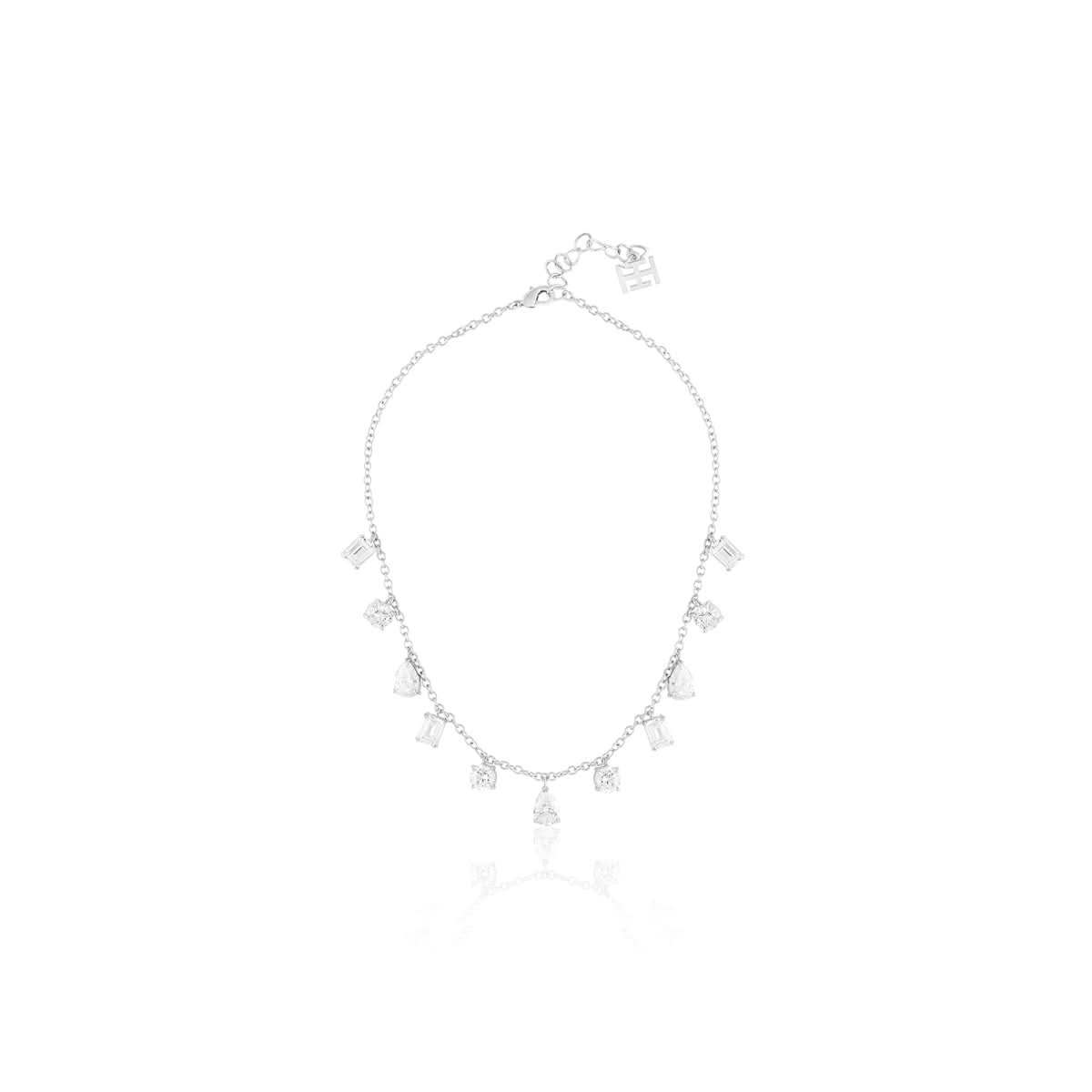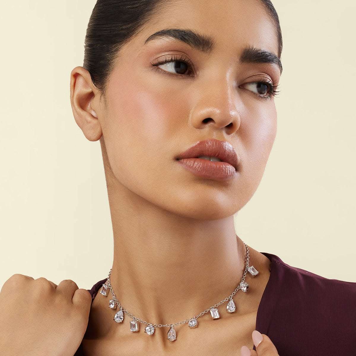 The Eterna Charm Choker Necklace from Isharya’s High Collection redefines elegance. Featuring high-quality crystal zirconia stones and crafted in rhodium-plated brass, this silver and white piece adds a bold touch to any social gathering or cocktail party.