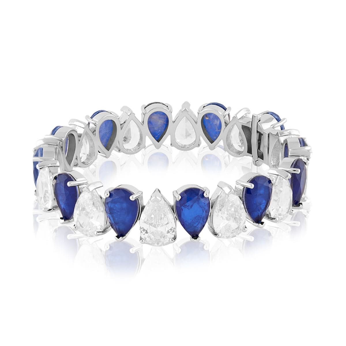 The Ethereal Sapphire Radiance Tennis Bracelet is a stunning statement piece featuring pear-shaped, high-quality doublet sapphire stones set in rhodium-plated brass. Inspired by classic tennis jewellery, it exudes timeless luxury.