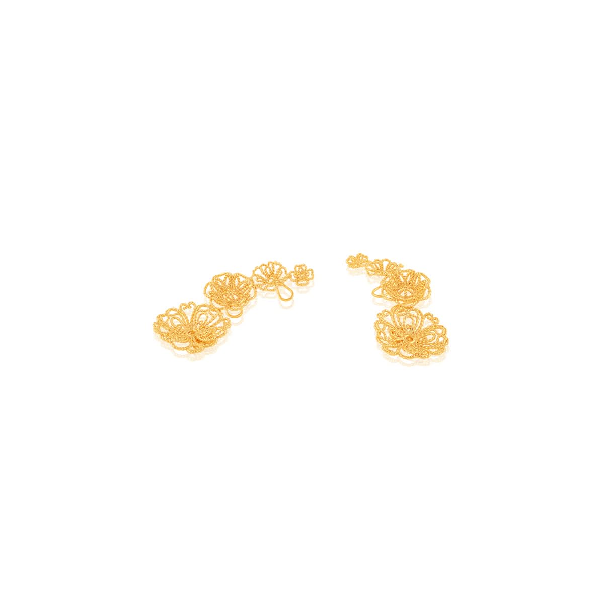 Bold gold-and-white ear climbers crafted in brass with 18k plating, inspired by Portuguese filigree and Isharya’s signature mirror work. Hypoallergenic and statement-making, perfect for weddings, parties, and festive soirées. Shop timeless luxury now.