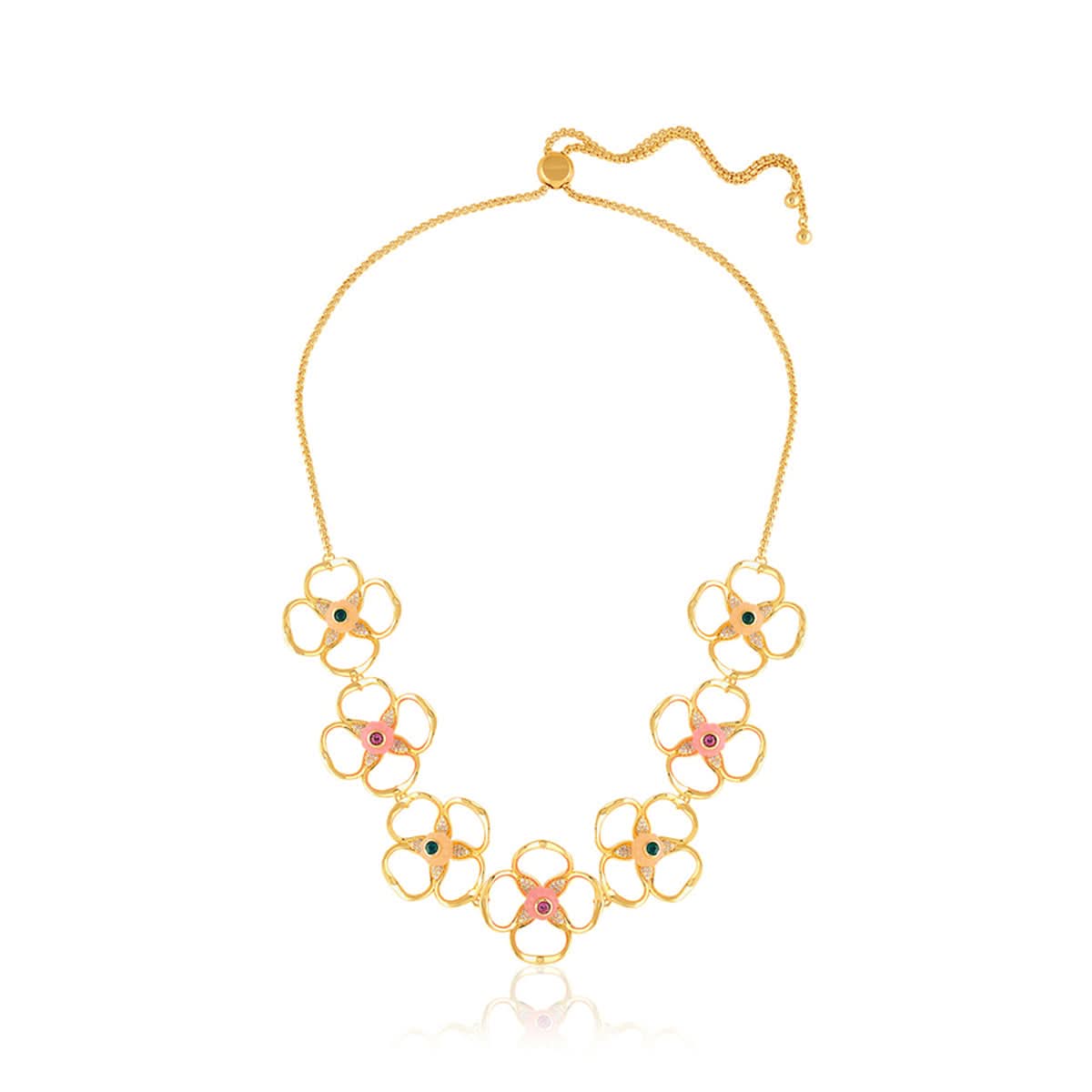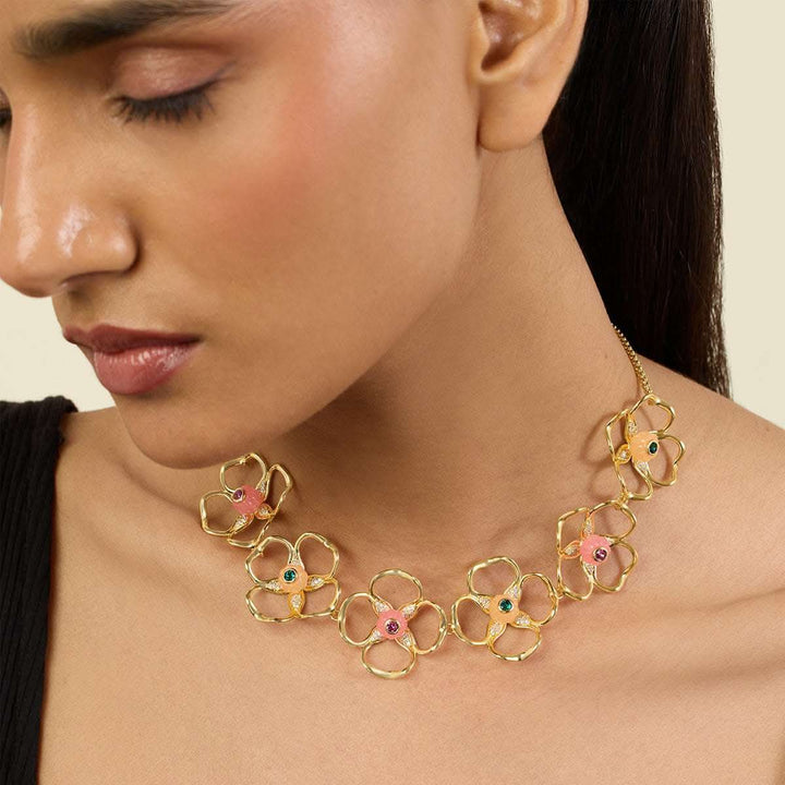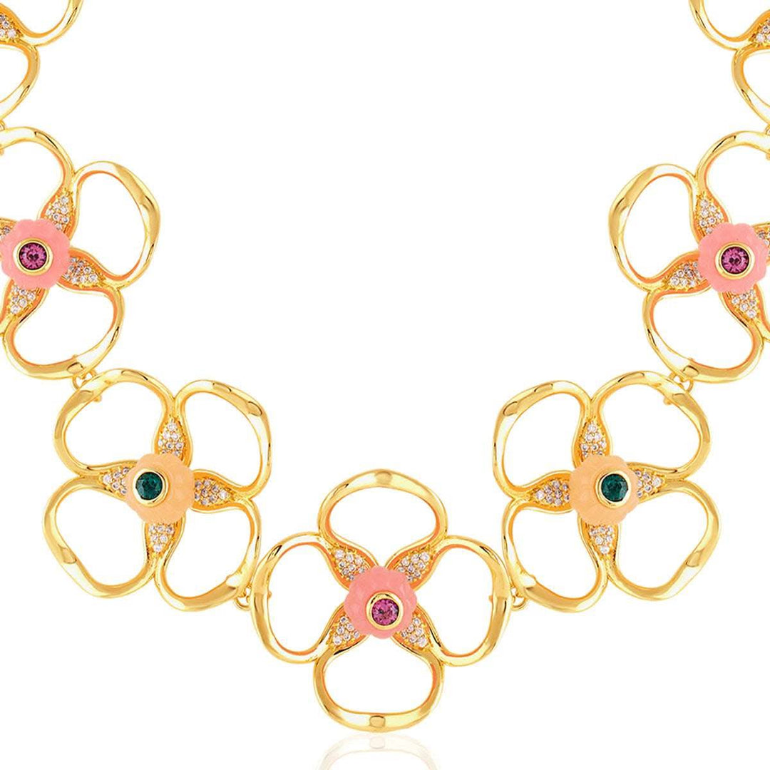 Bold and captivating, this statement choker necklace in green, dark rose, and gold is a stunning blend of artistry and elegance. Crafted in 18k gold-plated brass, it features crystal zirconia and resin detailing, inspired by nature’s whimsical garden motifs. Hypoallergenic and high-impact.