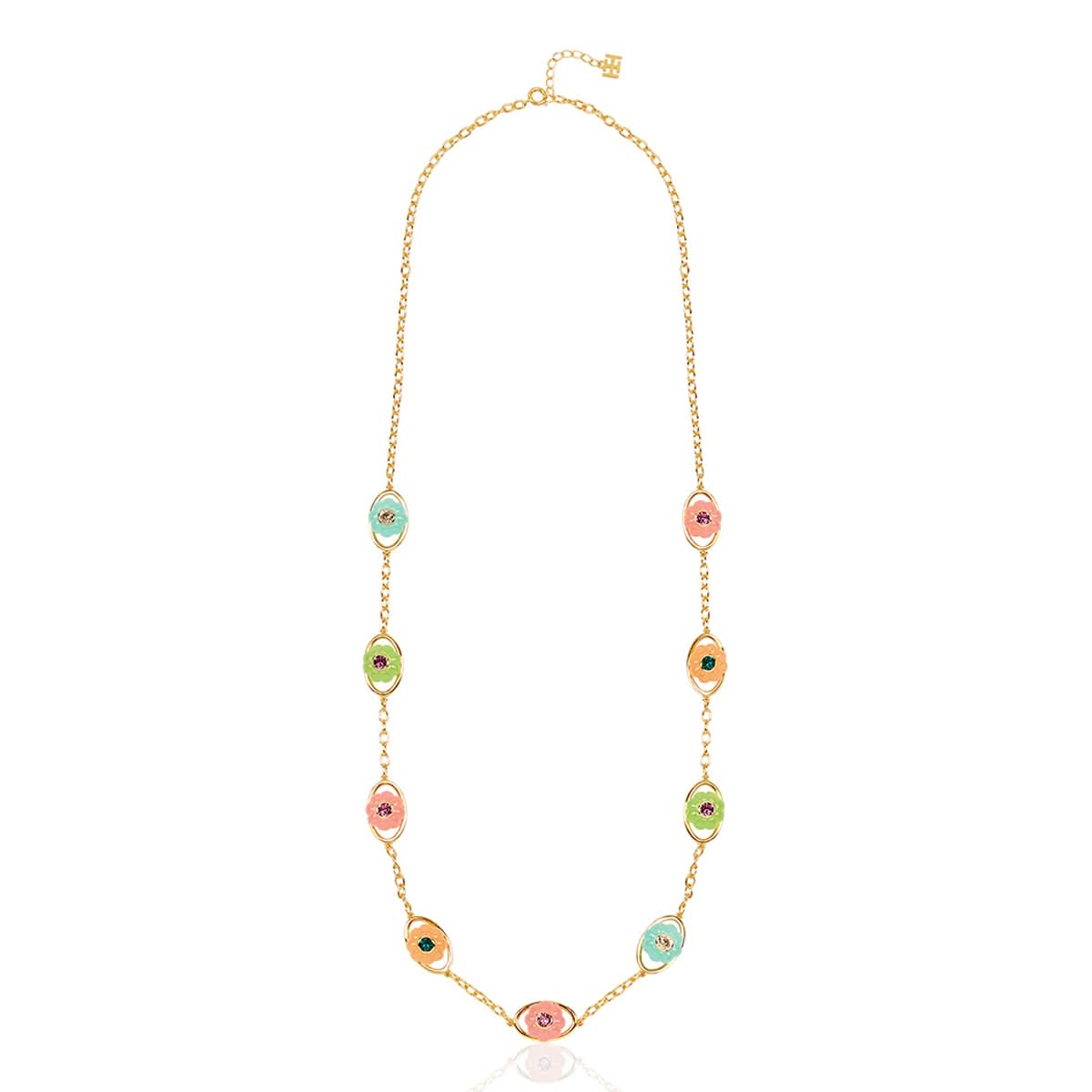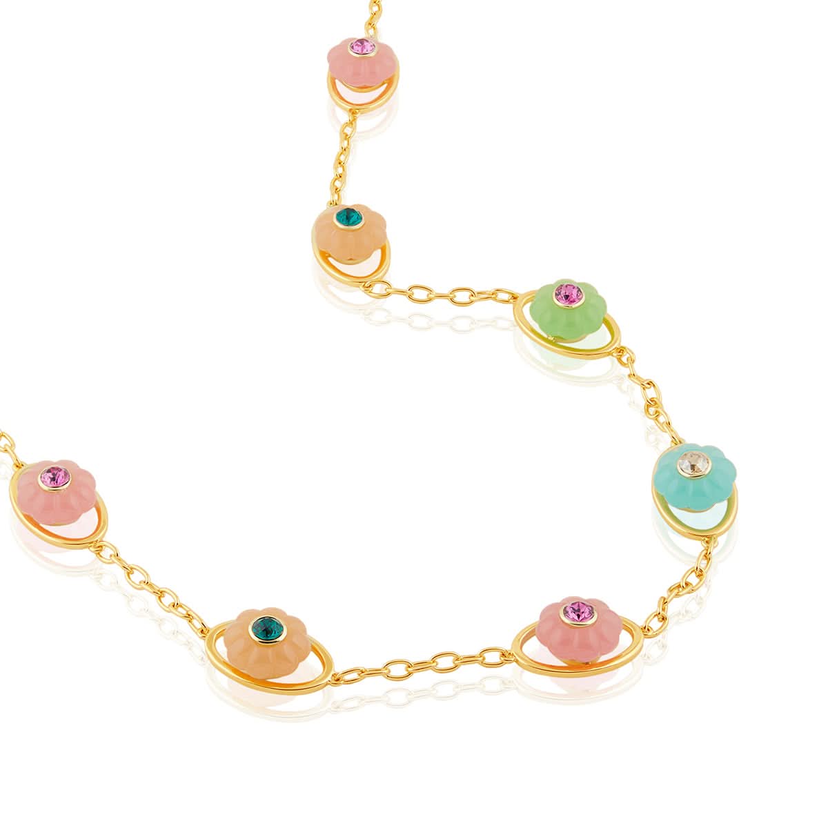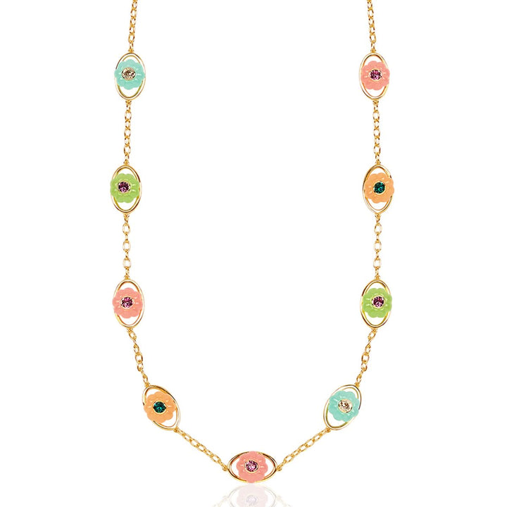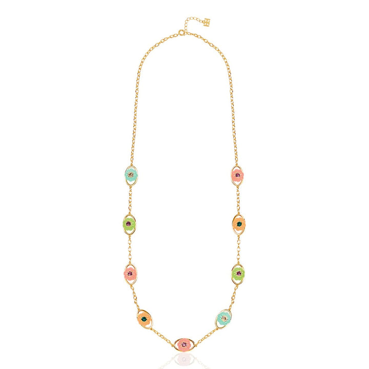 Elevate your look with this bold statement belt in green, blue, pink, dark rose, and gold. Featuring crystal zirconia and resin work, this piece is crafted from 18k gold-plated brass and inspired by whimsical garden motifs like flowers, snails, and dragonflies. Hypoallergenic and luxurious.