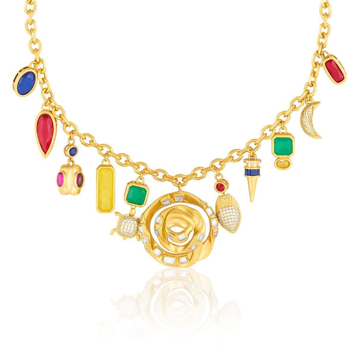 This vintage-inspired Gemstones Charm Necklace is crafted in brass and plated with 18k gold. It features exquisite green, blue, red and amethyst stones with chain link detailing. Style it with everything from heirloom sarees to cocktail dresses for every celebration.