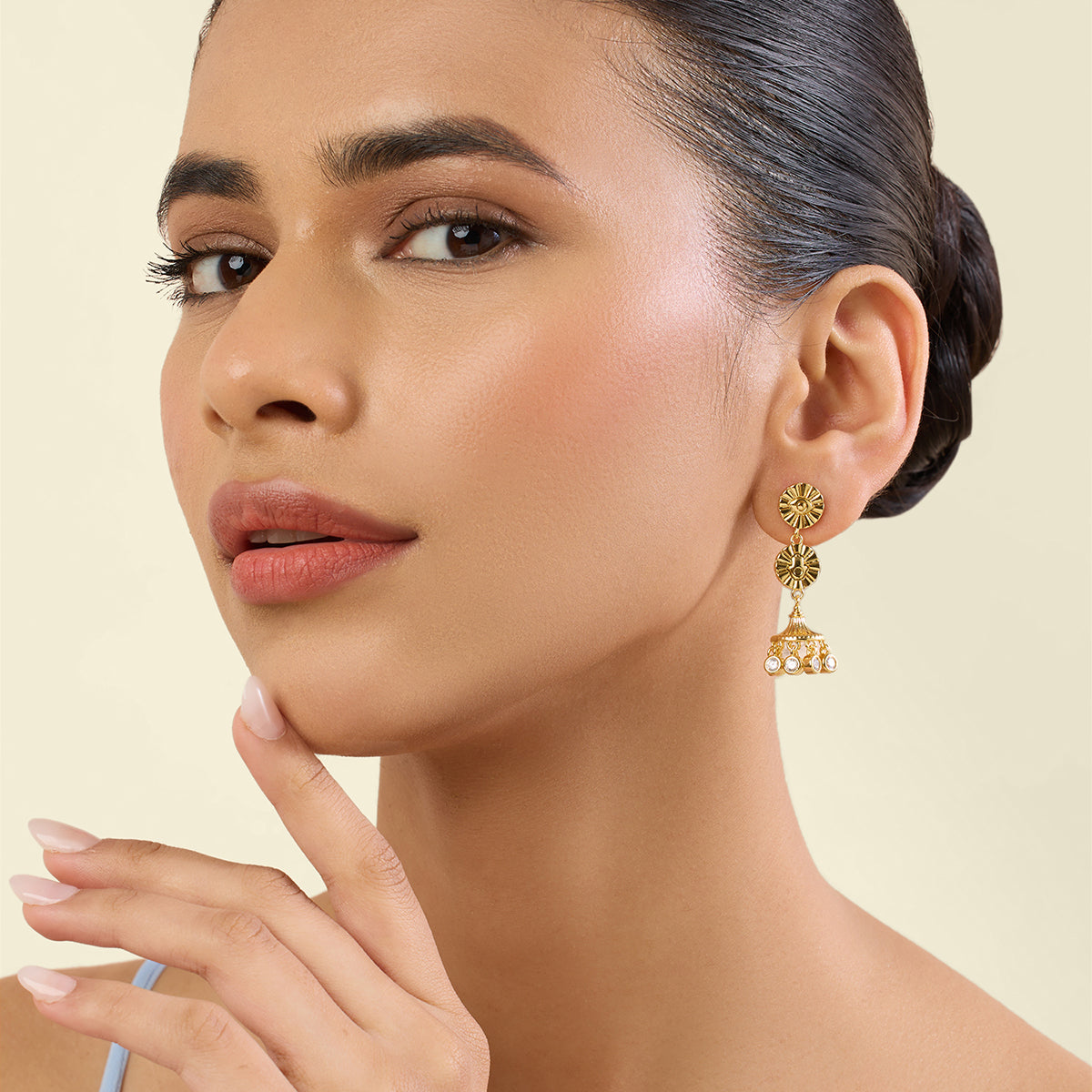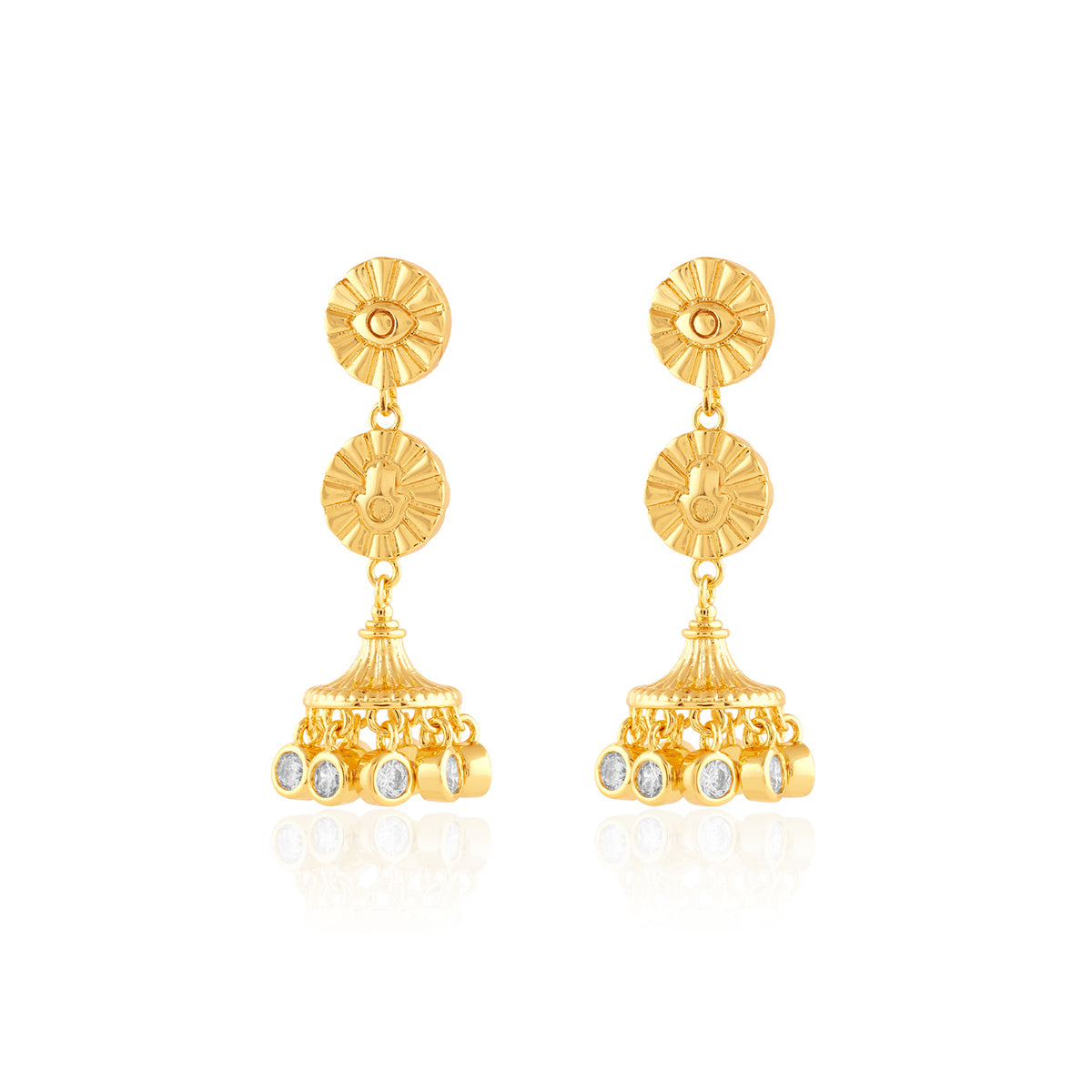 Make a bold statement with these gold-and-white jhumkas from I For Isharya. Crafted in brass with 18k gold plating and crystal zirconia, they reimagine temple motifs as future heirlooms. Perfect for weddings, soirées, and festive nights. Shop this modern luxury now.