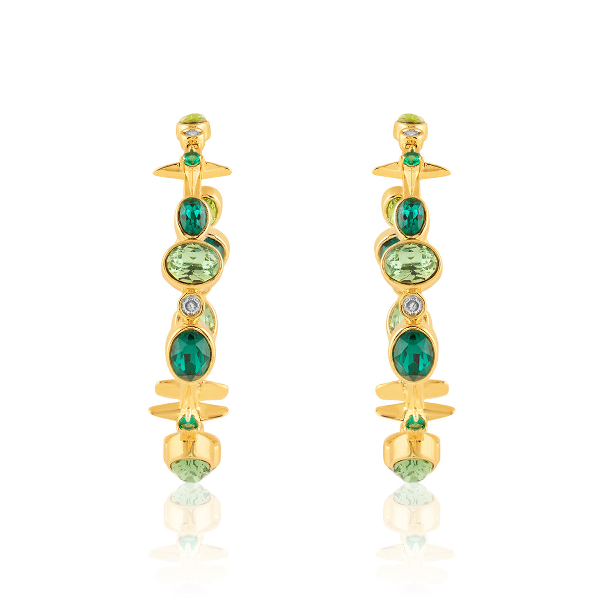 lluminate every occasion with these statement earrings, crafted in brass with 18k gold plating. Featuring crystal zirconia and cabochons, they echo cosmic constellations and ancient symbolism. Perfect for weddings, cocktails, and festive nights.
