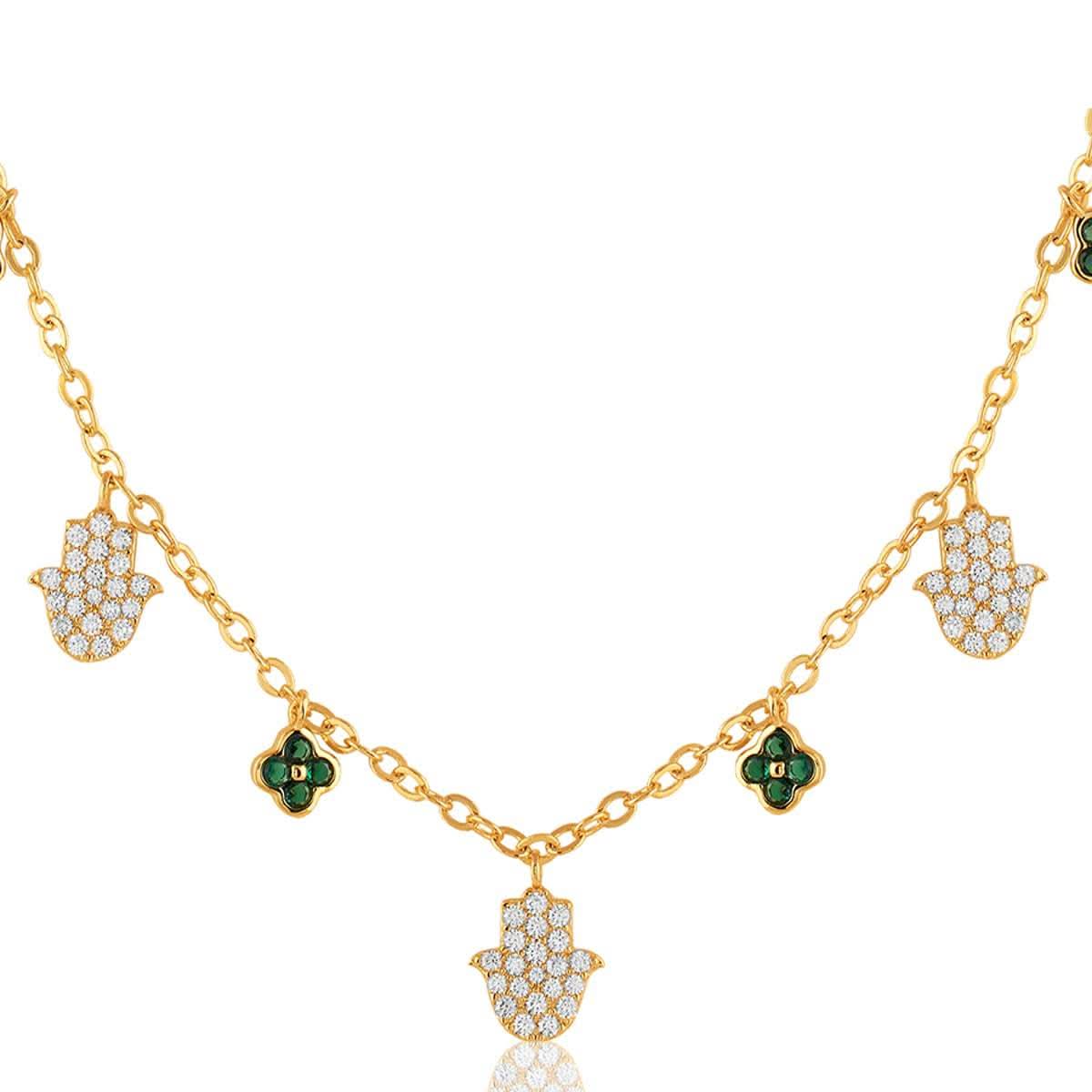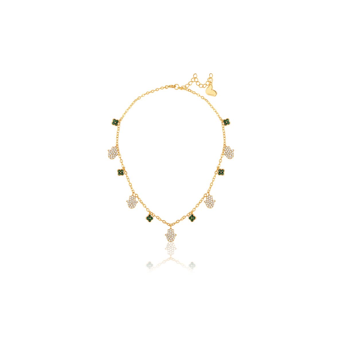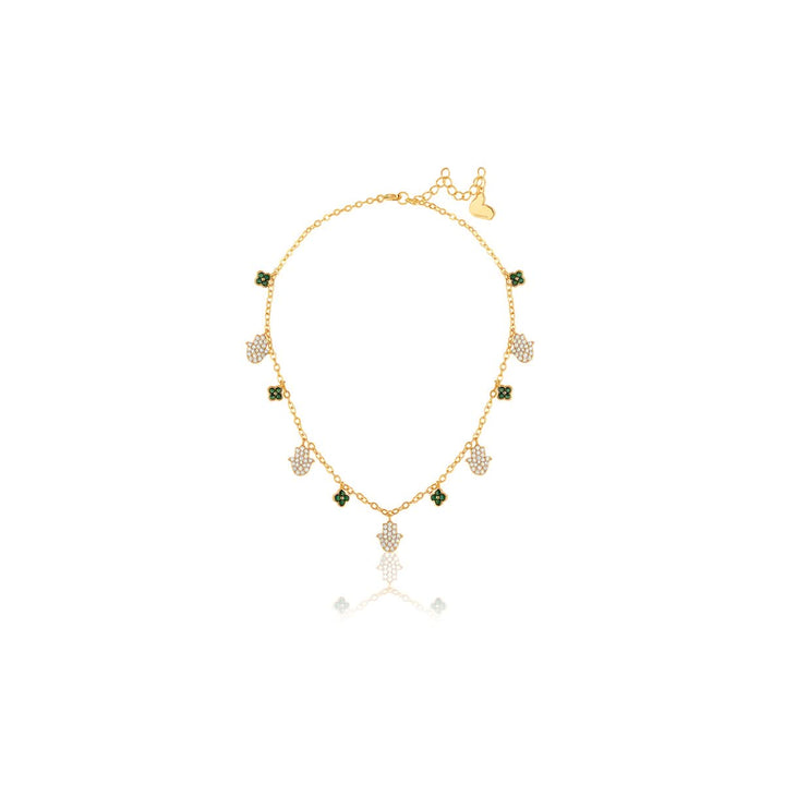 The Guardian Glow Necklace features Hamsa charms with green aventurine and crystal zirconia, set in 18k gold-plated brass. Hypoallergenic and spiritually inspired, it’s crafted for the fashion-forward soul.