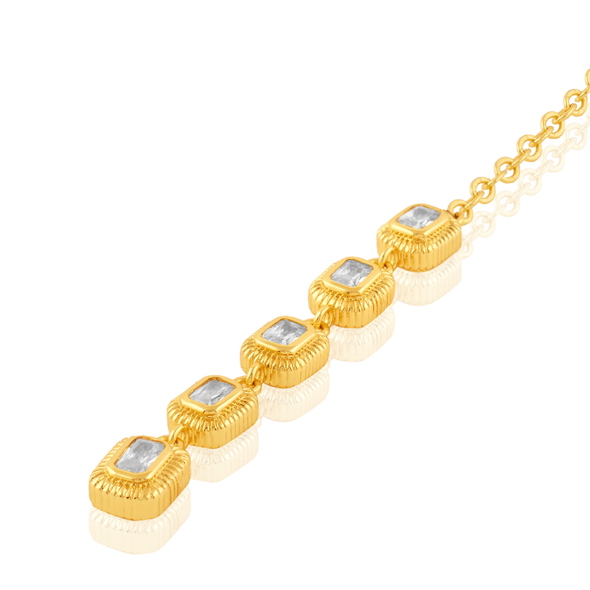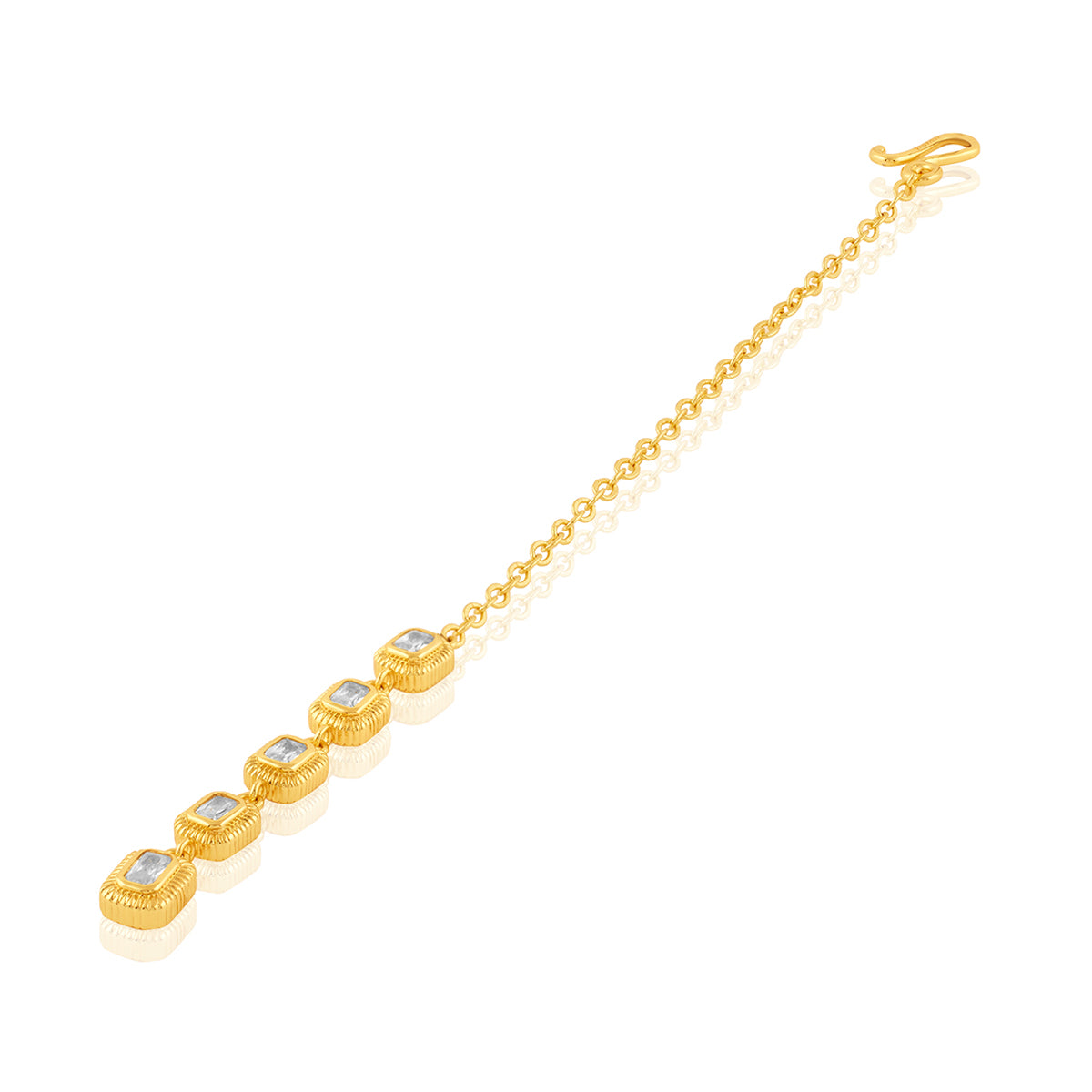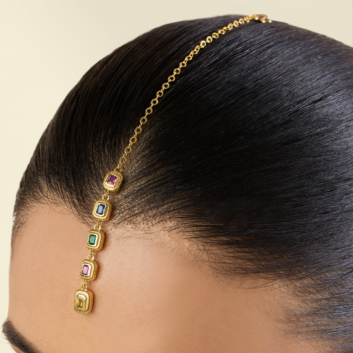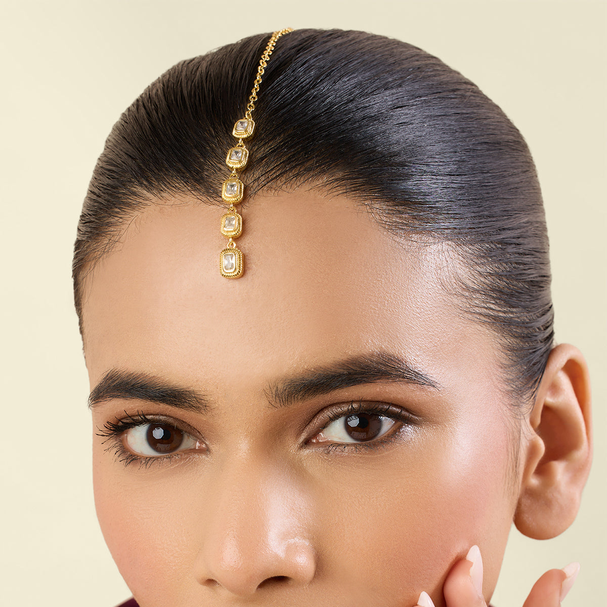 Crown your look with brilliance. This gold-and-white maang tikka, crafted in brass with 18k plating and crystal zirconia, reimagines temple motifs as future heirlooms. A versatile festive jewel for weddings, parties, or pujas. Style it solo or stack it bold. Shop now.